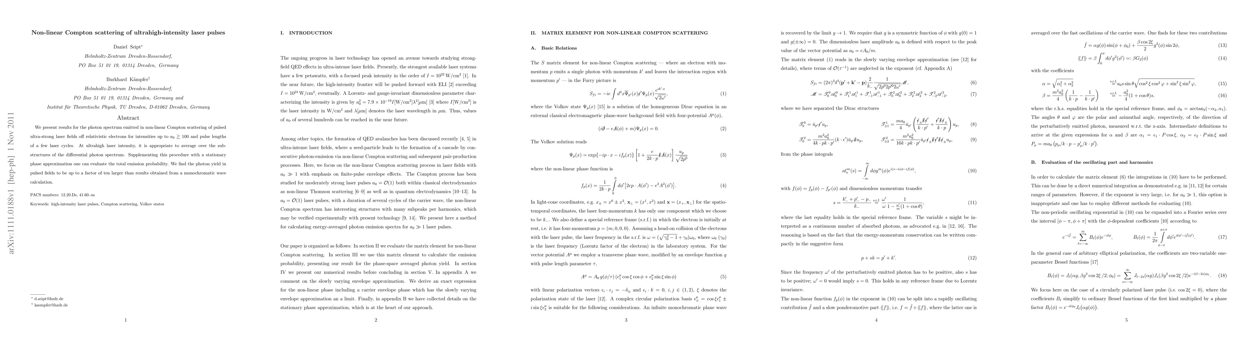 We present results for the photon spectrum emitted in non-linear Compton scattering of pulsed ultra-strong laser fields off relativistic electrons for intensities up to $a_0\gtrsim 100$ and pulse lengths of a few laser cycles. At ultrahigh laser intensity, it is appropriate to average over the sub- structures of the differential photon spectrum. Supplementing this procedure with a stationary phase approximation one can evaluate the total emission probability. We find the photon yield in pulsed fields to be up to a factor of ten larger than results obtained from a monochromatic wave calculation.