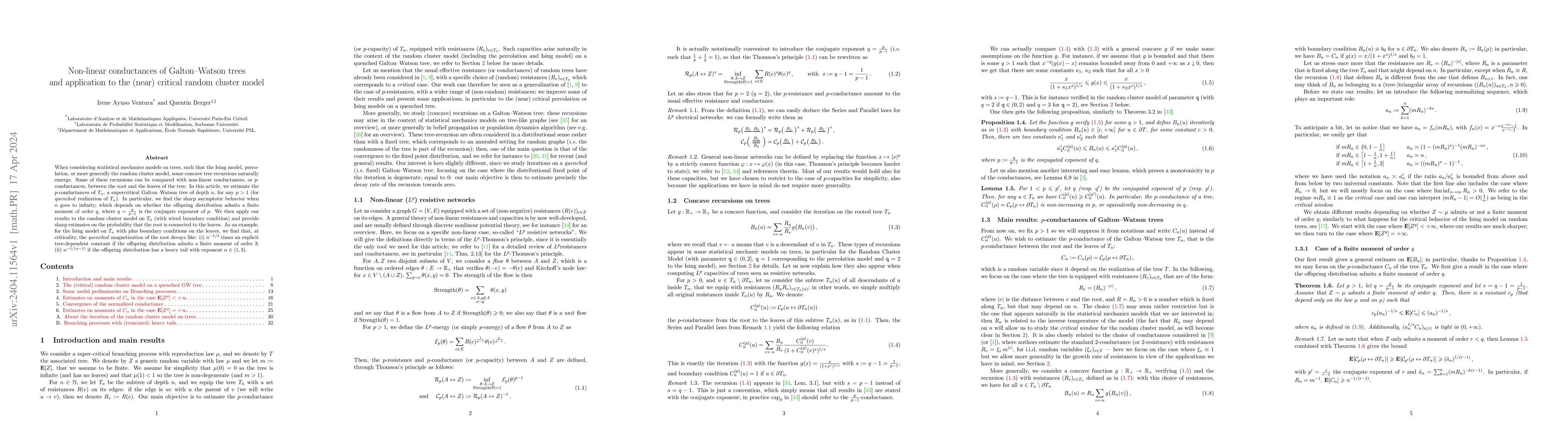 When considering statistical mechanics models on trees, such that the Ising model, percolation, or more generally the random cluster model, some concave tree recursions naturally emerge. Some of these recursions can be compared with non-linear conductances, or $p$-conductances, between the root and the leaves of the tree. In this article, we estimate the $p$-conductances of $T_n$, a supercritical Galton-Watson tree of depth $n$, for any $p>1$ (for a quenched realization of $T_n$). In particular, we find the sharp asymptotic behavior when $n$ goes to infinity, which depends on whether the offspring distribution admits a finite moment of order $q$, where $q=\frac{p}{p-1}$ is the conjugate exponent of $p$. We then apply our results to the random cluster model on~$T_n$ (with wired boundary condition) and provide sharp estimates on the probability that the root is connected to the leaves. As an example, for the Ising model on $T_n$ with plus boundary conditions on the leaves, we find that, at criticality, the quenched magnetization of the root decays like: (i) $n^{-1/2}$ times an explicit tree-dependent constant if the offspring distribution admits a finite moment of order $3$; (ii) $n^{-1/(\alpha-1)}$ if the offspring distribution has a heavy tail with exponent $\alpha \in (1,3)$.