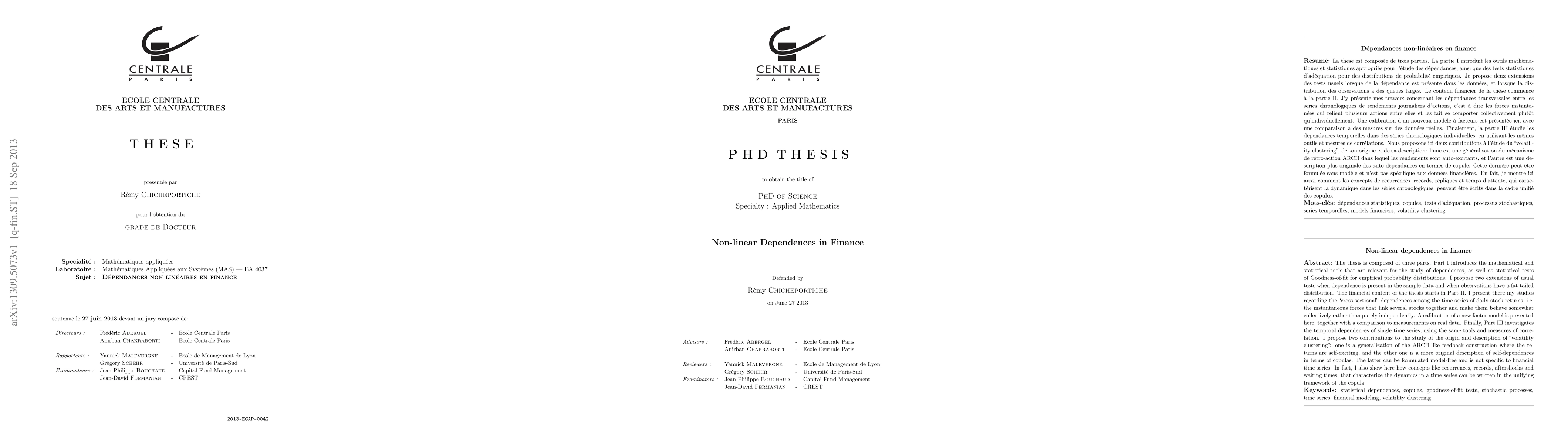 The thesis is composed of three parts. Part I introduces the mathematical and statistical tools that are relevant for the study of dependences, as well as statistical tests of Goodness-of-fit for empirical probability distributions. I propose two extensions of usual tests when dependence is present in the sample data and when observations have a fat-tailed distribution. The financial content of the thesis starts in Part II. I present there my studies regarding the "cross-sectional" dependences among the time series of daily stock returns, i.e. the instantaneous forces that link several stocks together and make them behave somewhat collectively rather than purely independently. A calibration of a new factor model is presented here, together with a comparison to measurements on real data. Finally, Part III investigates the temporal dependences of single time series, using the same tools and measures of correlation. I propose two contributions to the study of the origin and description of "volatility clustering": one is a generalization of the ARCH-like feedback construction where the returns are self-exciting, and the other one is a more original description of self-dependences in terms of copulas. The latter can be formulated model-free and is not specific to financial time series. In fact, I also show here how concepts like recurrences, records, aftershocks and waiting times, that characterize the dynamics in a time series can be written in the unifying framework of the copula.