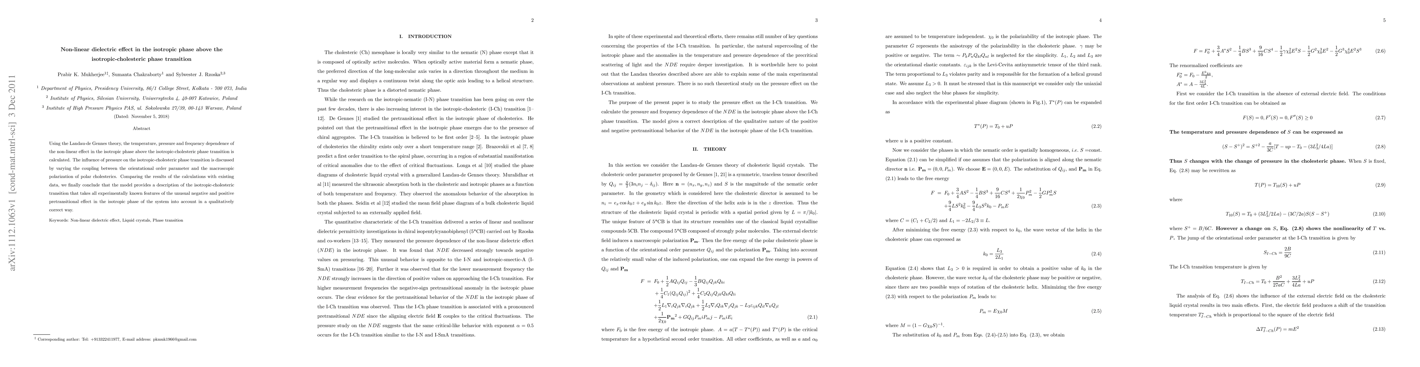This paper uses Landau-de Gennes theory to analyze the non-linear dielectric effect in the isotropic phase above the isotropic-cholesteric phase transition, considering temperature, pressure, and frequency dependencies. The model accurately describes the observed pretransitional effects in the isotropic phase, aligning with existing experimental data.