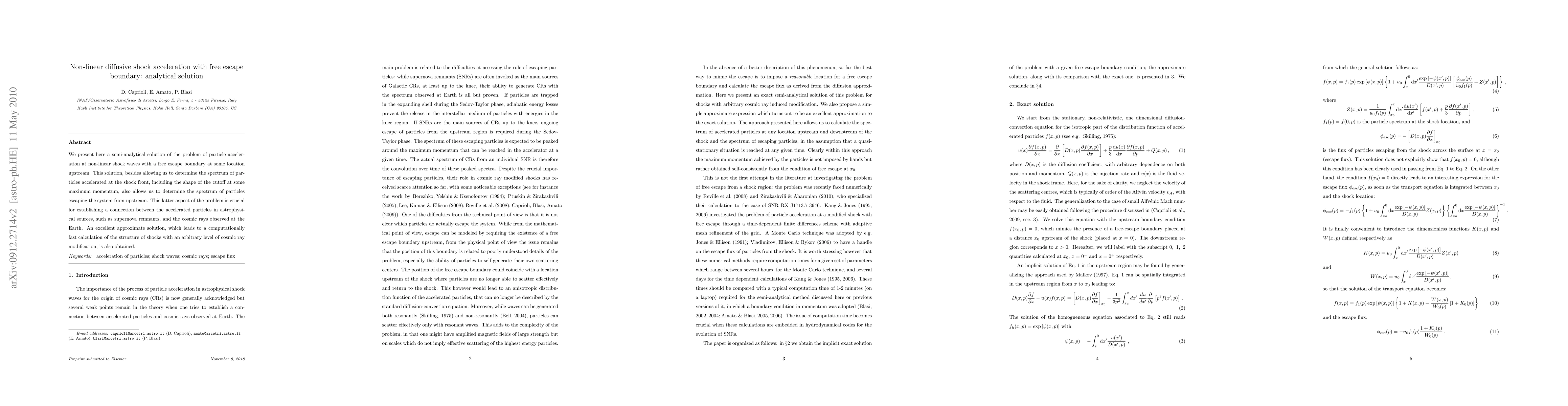 This research provides a semi-analytical solution for particle acceleration at non-linear shock waves with a free escape boundary, determining both the accelerated particle spectrum and the escaping particle spectrum. It offers a fast computational method to study shock structures under various cosmic ray modifications, crucial for linking accelerated particles in astrophysical sources to observed cosmic rays at Earth.