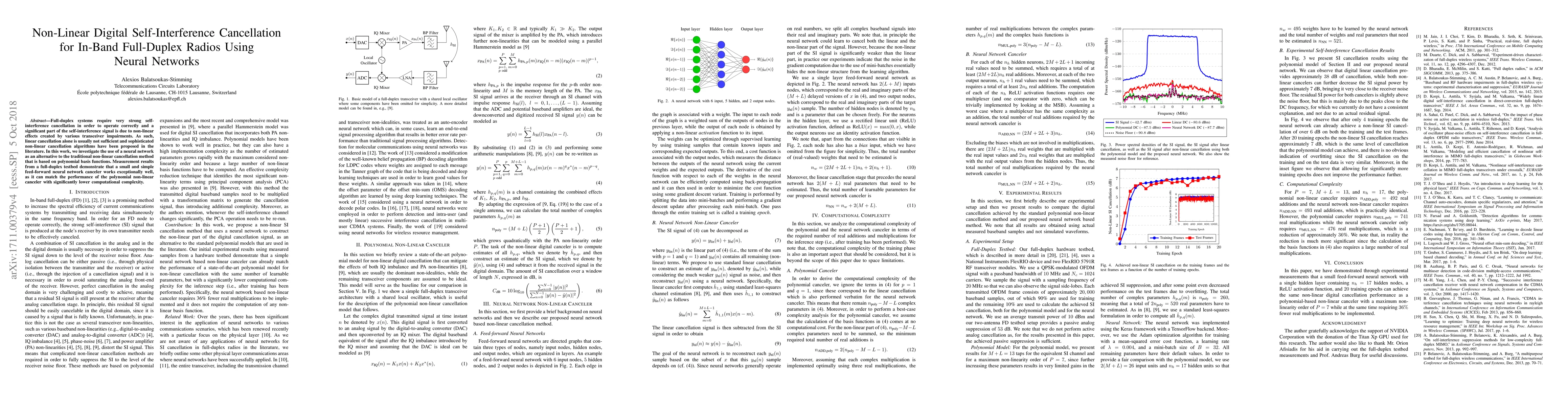 This paper explores the use of a neural network for non-linear self-interference cancellation in in-band full-duplex radios, demonstrating that a small feed-forward neural network achieves comparable performance to traditional polynomial-based methods with lower computational complexity.