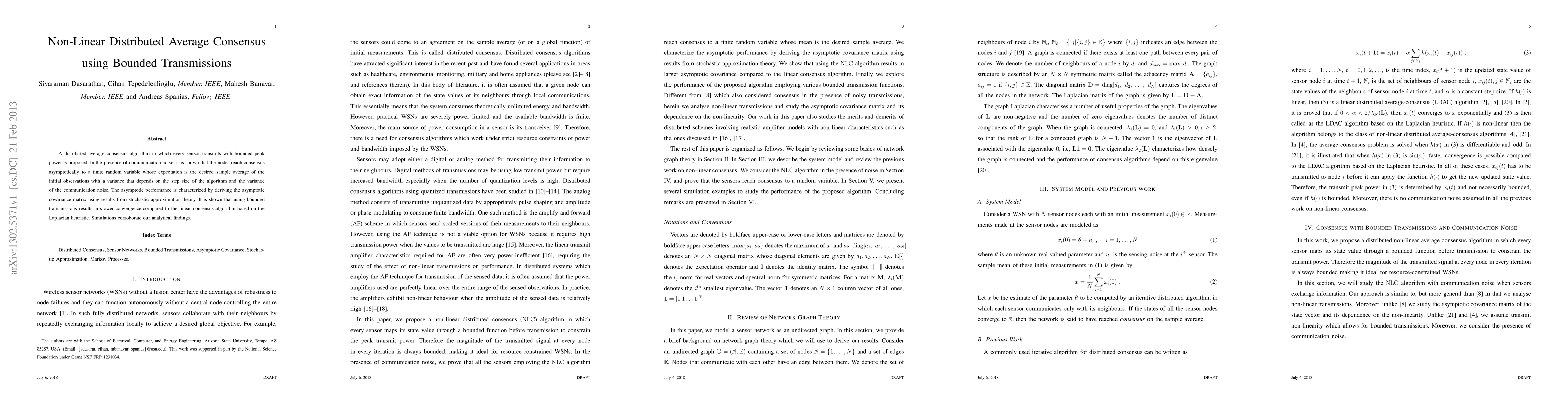 This paper proposes a distributed average consensus algorithm for sensors with bounded transmission power, demonstrating asymptotic convergence to a random variable representing the initial observations' average. The algorithm's convergence speed is slower than linear consensus methods due to bounded transmissions, and simulations validate the analytical results.