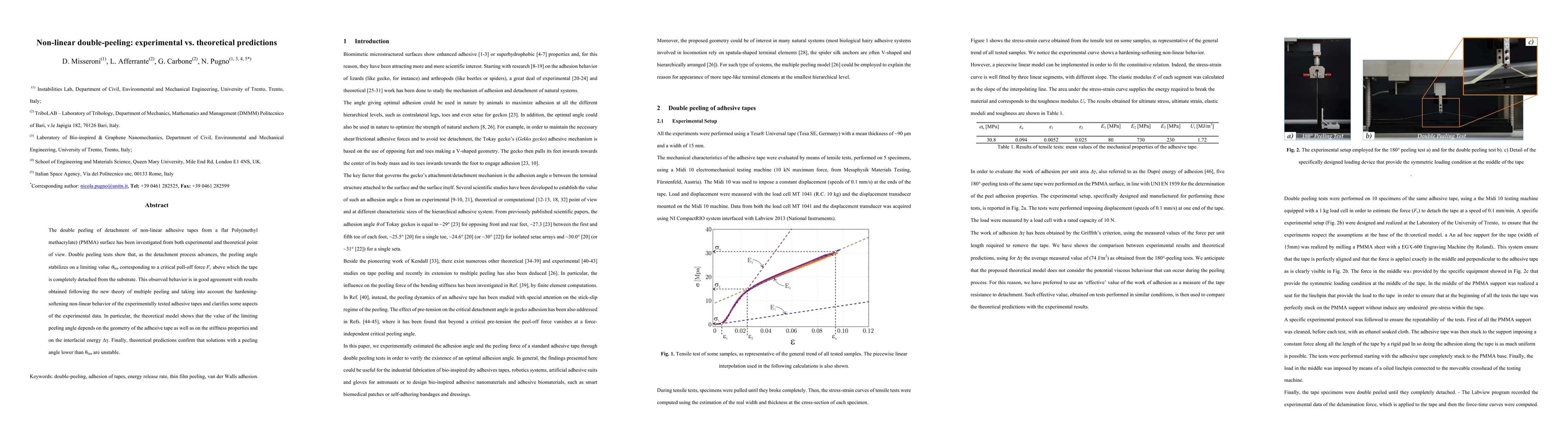 The double peeling of detachment of non-linear adhesive tapes from a flat Poly(methylmethacrylate) (PMMA) surface has been investigated from both experimental and theoretical point of view. Double peeling tests show that, as the detachment process advances, the peeling angle stabilizes on a limiting value {\theta}lim corresponding to a critical pull-off force Fc above which the tape is completely detached from the substrate. This observed behavior is in good agreement with results obtained following the new theory of multiple peeling and taking into account the hardening-softening non-linear behavior of the experimentally tested adhesive tapes and clarifies some aspects of the experimental data. In particular, the theoretical model shows that the value of the limiting peeling angle depends on the geometry of the adhesive tape as well as on the stiffness properties and on the interfacial energy {\Delta}{\gamma}. Finally, theoretical predictions confirm that solutions with a peeling angle lower than {\theta}lim are unstable.