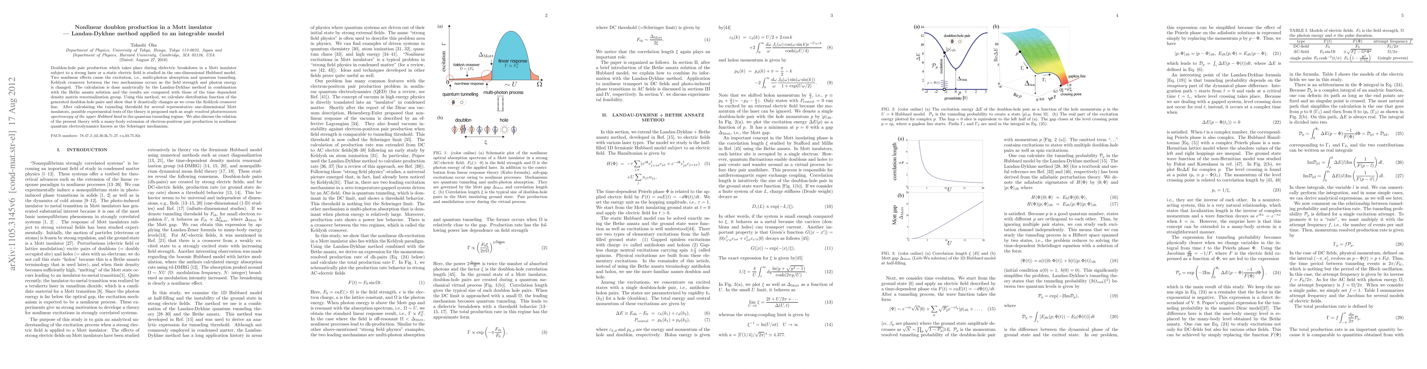 This paper studies doublon-hole pair production in a one-dimensional Mott insulator using the Landau-Dykhne method, revealing how multi-photon absorption and quantum tunneling drive this process. The study proposes experimental tests and connects the findings to the Schwinger mechanism in nonlinear quantum electrodynamics.