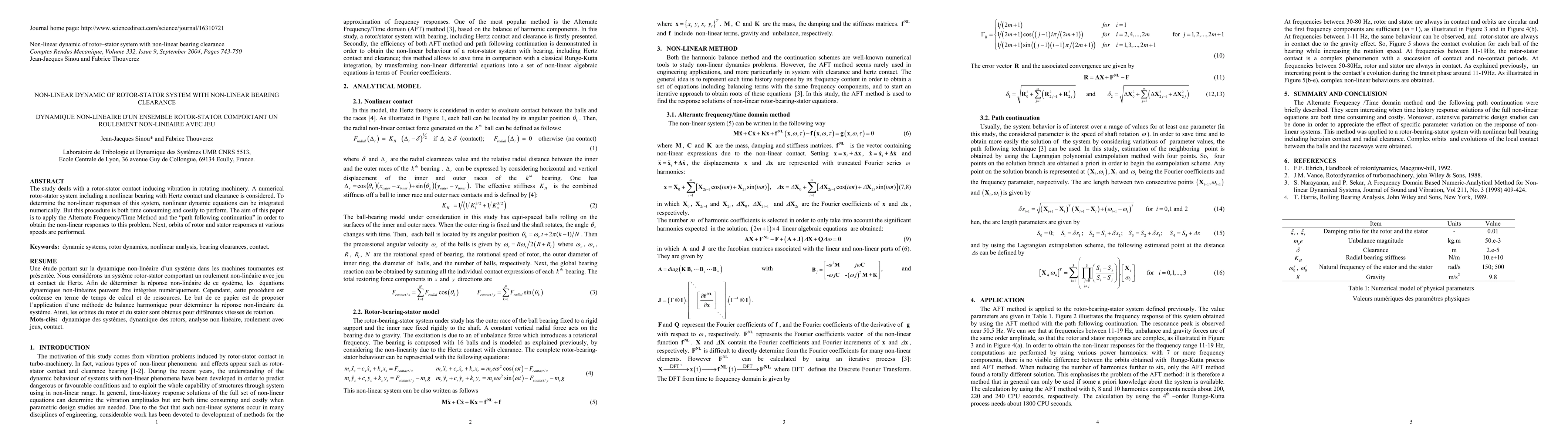 The study deals with a rotor-stator contact inducing vibration in rotating machinery. A numerical rotor-stator system, including a non-linear bearing with Hertz contact and clearance is considered. To determine the non-linear responses of this system, non-linear dynamic equations can be integrated numerically. However, this procedure is both time consuming and costly to perform. The aim of this Note is to apply the Alternate Frequency/Time Method and the 'path following continuation' in order to obtain the non-linear responses to this problem. Then the orbits of rotor and stator responses at various speeds are investigated.