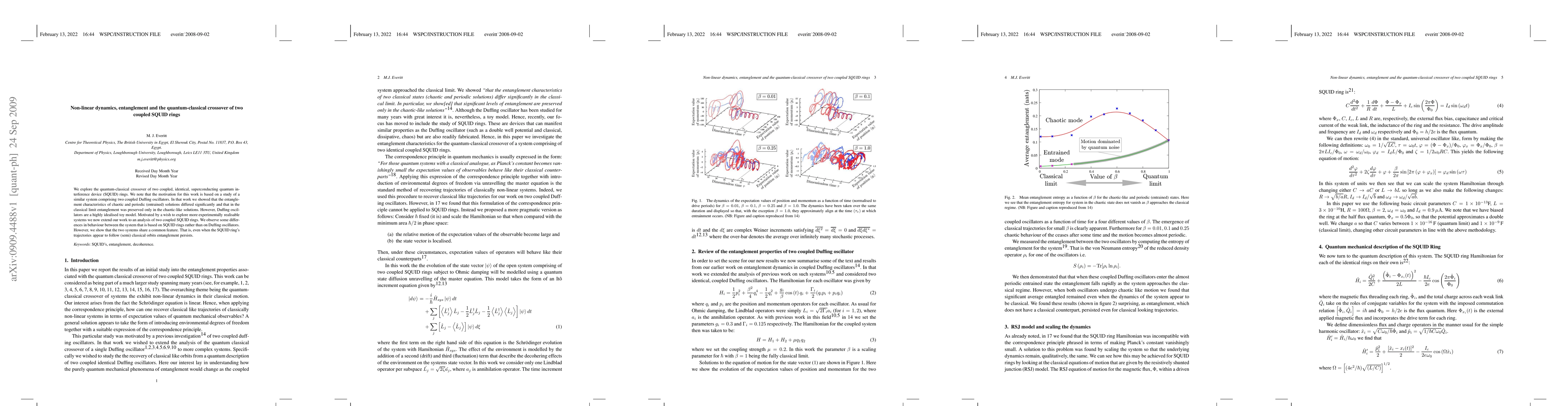 We explore the quantum-classical crossover of two coupled, identical, superconducting quantum interference device (SQUID) rings. We note that the motivation for this work is based on a study of a similar system comprising two coupled Duffing oscillators. In that work we showed that the entanglement characteristics of chaotic and periodic (entrained) solutions differed significantly and that in the classical limit entanglement was preserved only in the chaotic-like solutions. However, Duffing oscillators are a highly idealised toy model. Motivated by a wish to explore more experimentally realisable systems we now extend our work to an analysis of two coupled SQUID rings. We observe some differences in behaviour between the system that is based on SQUID rings rather than on Duffing oscillators. However, we show that the two systems share a common feature. That is, even when the SQUID ring's trajectories appear to follow (semi) classical orbits entanglement persists.