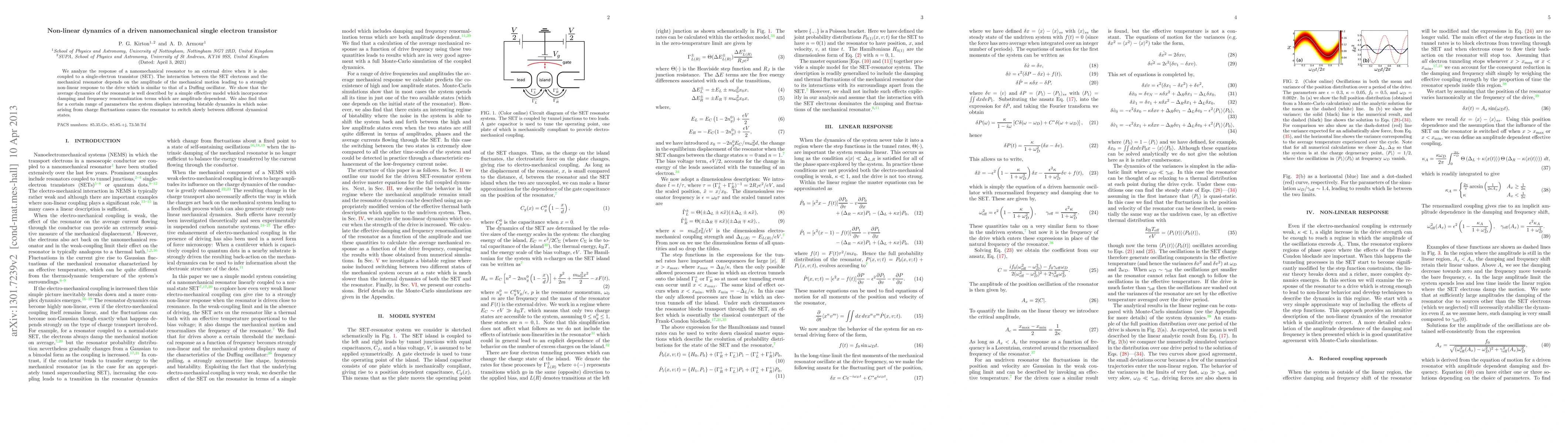 This paper investigates the non-linear dynamics of a nanomechanical resonator coupled to a single-electron transistor under external drive, revealing a response akin to a Duffing oscillator. An effective model describes the resonator's average dynamics with amplitude-dependent damping and frequency renormalization, and identifies bistable behavior influenced by charge fluctuation noise.