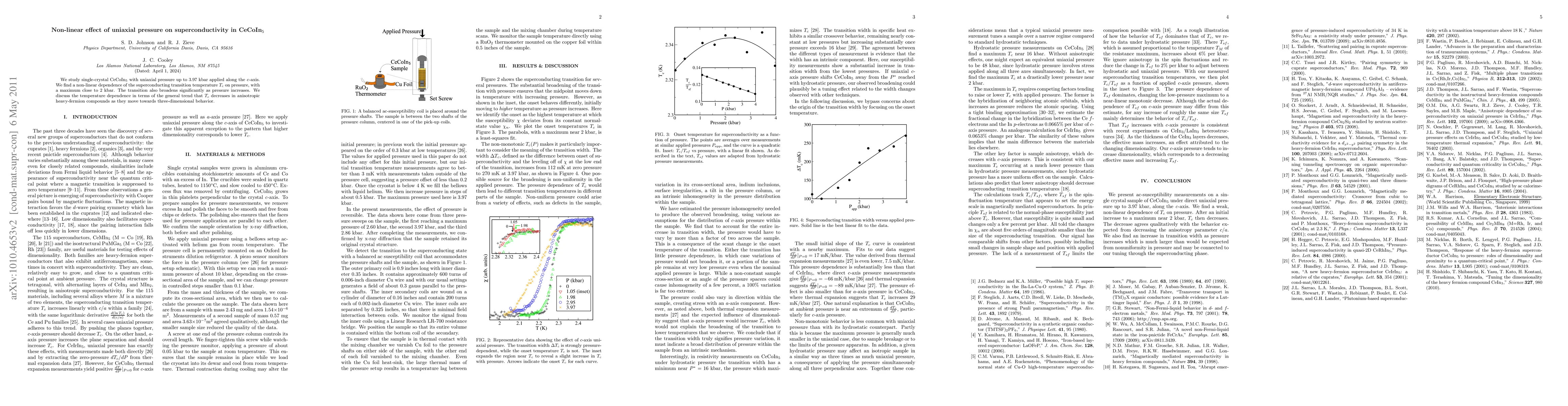 We study single-crystal CeCoIn5 with uniaxial pressure up to 3.97 kbar applied along the c-axis. We find a non-linear dependence of the superconducting transition temperature Tc on pressure, with a maximum close to 2 kbar. The transition also broadens significantly as pressure increases. We discuss the temperature dependence in terms of the general trend that Tc decreases in anisotropic heavy-fermion compounds as they move towards three-dimensional behavior.