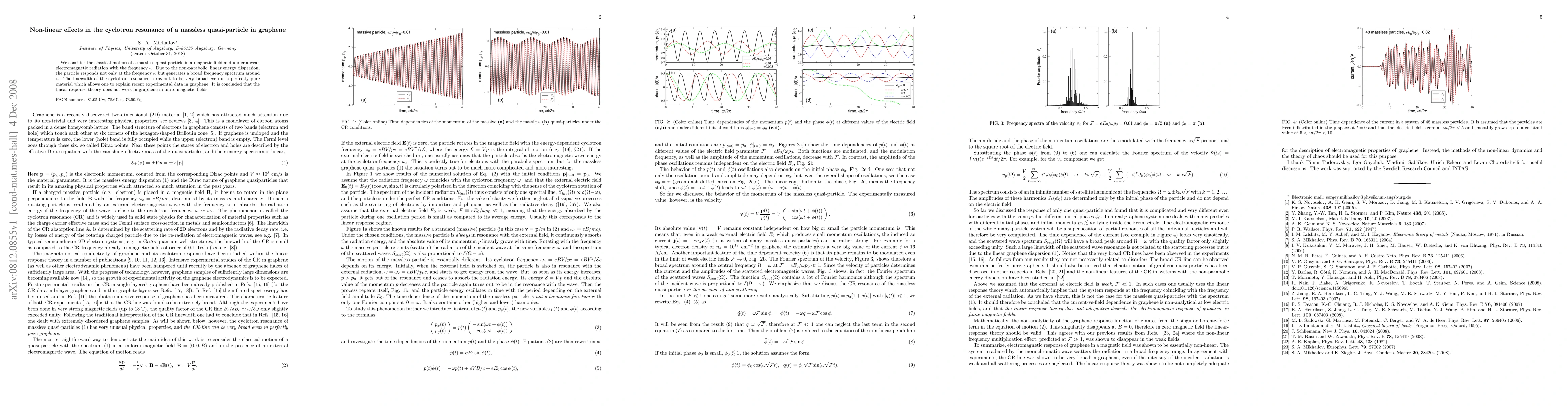 This study investigates the cyclotron resonance of massless quasi-particles in graphene under a magnetic field and weak electromagnetic radiation, revealing a broad frequency spectrum due to non-linear effects. The findings suggest that linear response theory is inadequate for explaining cyclotron resonance in graphene under finite magnetic fields.