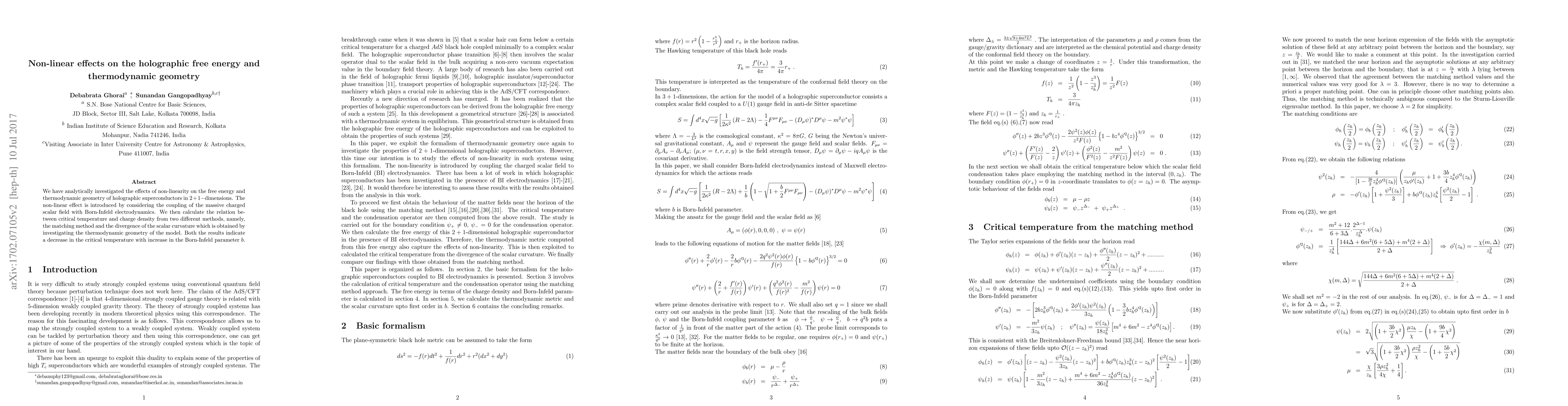 We have analytically investigated the effects of non-linearity on the free energy and thermodynamic geometry of holographic superconductors in $2+1 -$dimensions. The non-linear effect is introduced by considering the coupling of the massive charged scalar field with Born-Infeld electrodynamics. We then calculate the relation between critical temperature and charge density from two different methods, namely, the matching method and the divergence of the scalar curvature which is obtained by investigating the thermodynamic geometry of the model. The two results are slightly different from numerical values but the effects of non-linearity gets captured in our analysis.