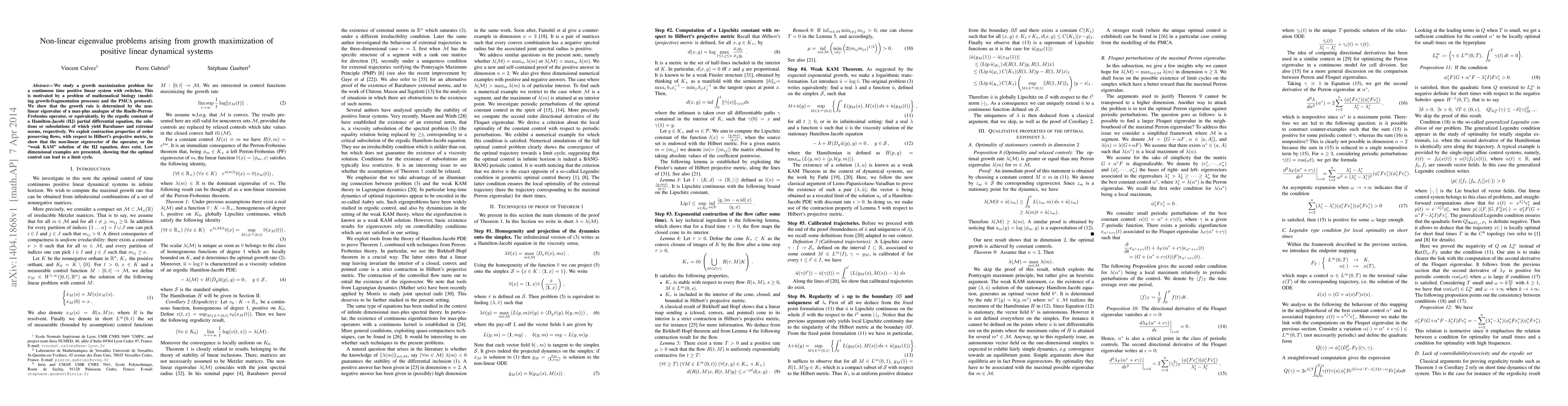 We study a growth maximization problem for a continuous time positive linear system with switches. This is motivated by a problem of mathematical biology (modeling growth-fragmentation processes and the PMCA protocol). We show that the growth rate is determined by the non-linear eigenvalue of a max-plus analogue of the Ruelle-Perron-Frobenius operator, or equivalently, by the ergodic constant of a Hamilton-Jacobi (HJ) partial differential equation, the solutions or subsolutions of which yield Barabanov and extremal norms, respectively. We exploit contraction properties of order preserving flows, with respect to Hilbert's projective metric, to show that the non-linear eigenvector of the operator, or the "weak KAM" solution of the HJ equation, does exist. Low dimensional examples are presented, showing that the optimal control can lead to a limit cycle.
