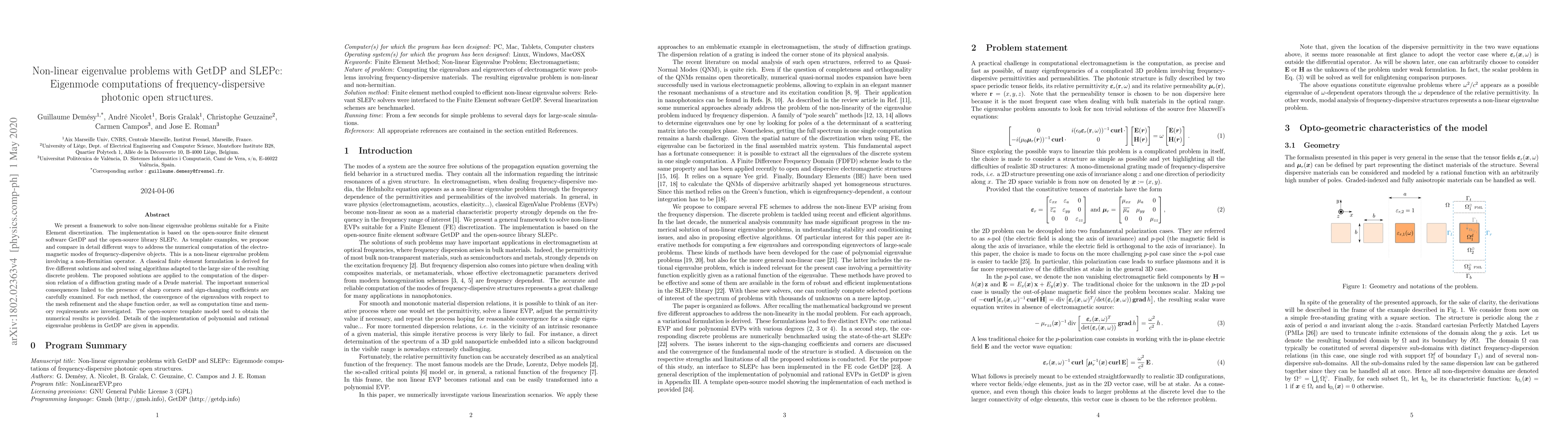 We present a framework to solve non-linear eigenvalue problems suitable for a Finite Element discretization. The implementation is based on the open-source finite element software GetDP and the open-source library SLEPc. As template examples, we propose and compare in detail different ways to address the numerical computation of the electromagnetic modes of frequency-dispersive objects. This is a non-linear eigenvalue problem involving a non-Hermitian operator. A classical finite element formulation is derived for five different solutions and solved using algorithms adapted to the large size of the resulting discrete problem. The proposed solutions are applied to the computation of the dispersion relation of a diffraction grating made of a Drude material. The important numerical consequences linked to the presence of sharp corners and sign-changing coefficients are carefully examined. For each method, the convergence of the eigenvalues with respect to the mesh refinement and the shape function order, as well as computation time and memory requirements are investigated. The open-source template model used to obtain the numerical results is provided. Details of the implementation of polynomial and rational eigenvalue problems in GetDP are given in appendix.