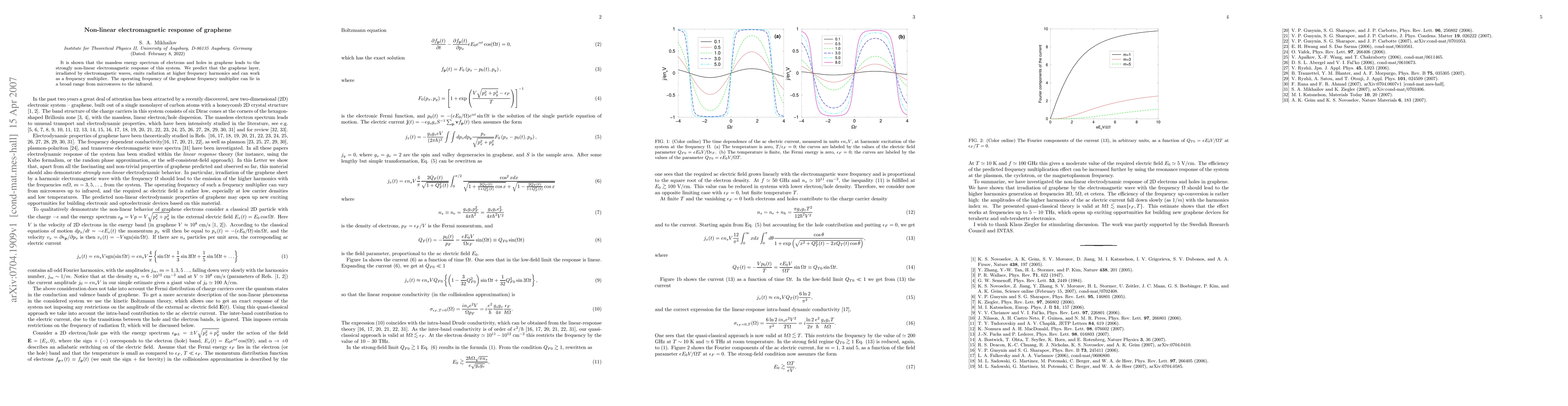 This study reveals that graphene's massless electron-hole spectrum results in a strongly non-linear electromagnetic response, enabling it to emit higher frequency harmonics under electromagnetic wave irradiation, functioning as a frequency multiplier across a wide range from microwaves to infrared.