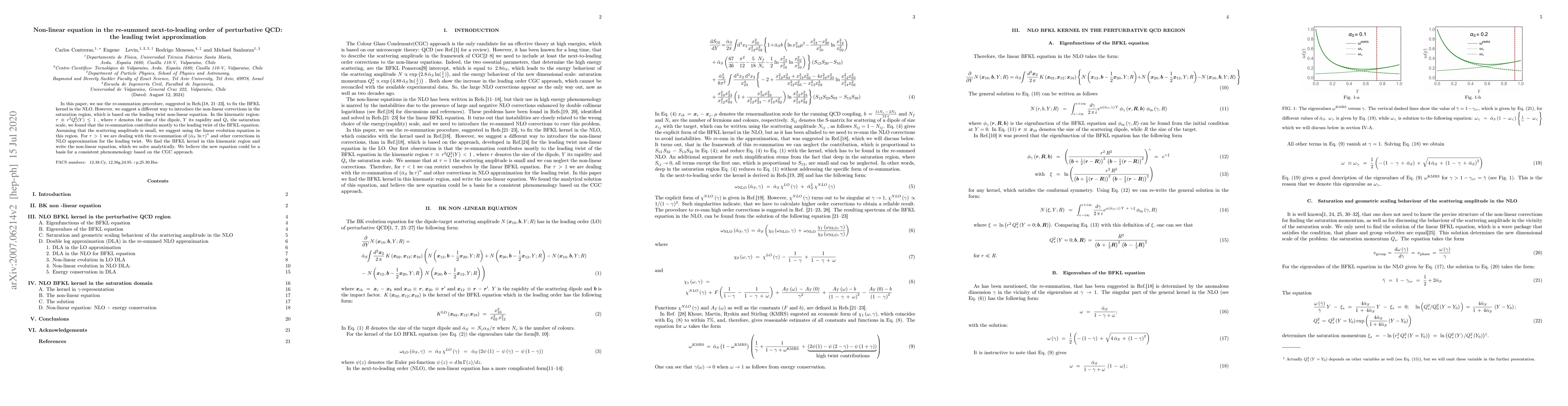 In this paper, we use the re-summation procedure, suggested in Refs.\cite{DIMST,SALAM,SALAM1,SALAM2}, to fix the BFKL kernel in the NLO. However, we suggest a different way to introduce th non-linear corrections in the saturation region, which is based on the leading twist non-linear equation. In the kinematic region:$\tau\,\equiv\,r^2 Q^2_s(Y)\,\leq\,1$ , where $r$ denotes the size of the dipole, $Y$ its rapidity and $Q_s$ the saturation scale, we found that the re-summation contributes mostly to the leading twist of the BFKL equation. Assuming that the scattering amplitude is small, we suggest using the linear evolution equation in this region. For $\tau \,>\,1$ we are dealing with the re-summation of $\Lb \bas \,\ln \tau\Rb^n$ and other corrections in NLO approximation for the leading twist.We find the BFKL kernel in this kinematic region and write the non-linear equation, which we solve analytically. We believe the new equation could be a basis for a consistent phenomenology based on the CGC approach.