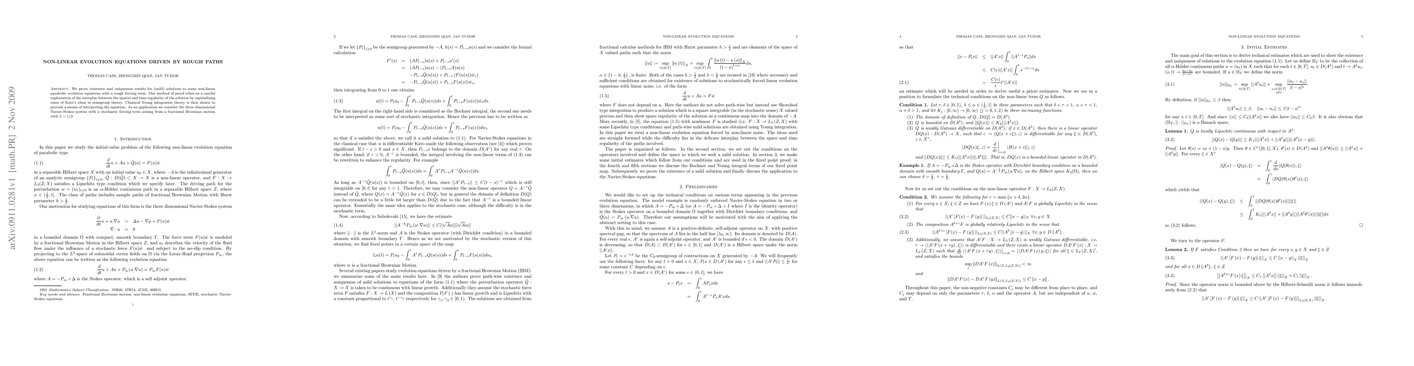 We prove existence and uniqueness results for (mild) solutions to some non-linear parabolic evolution equations with a rough forcing term. Our method of proof relies on a careful exploitation of the interplay between the spatial and time regularity of the solution by capitialising some of Kato's ideas in semigroup theory. Classical Young integration theory is then shown to provide a means of interpreting the equation. As an application we consider the three dimensional Navier-Stokes system with a stochastic forcing term arising from a fractional Brownian motion with h > 1/2.