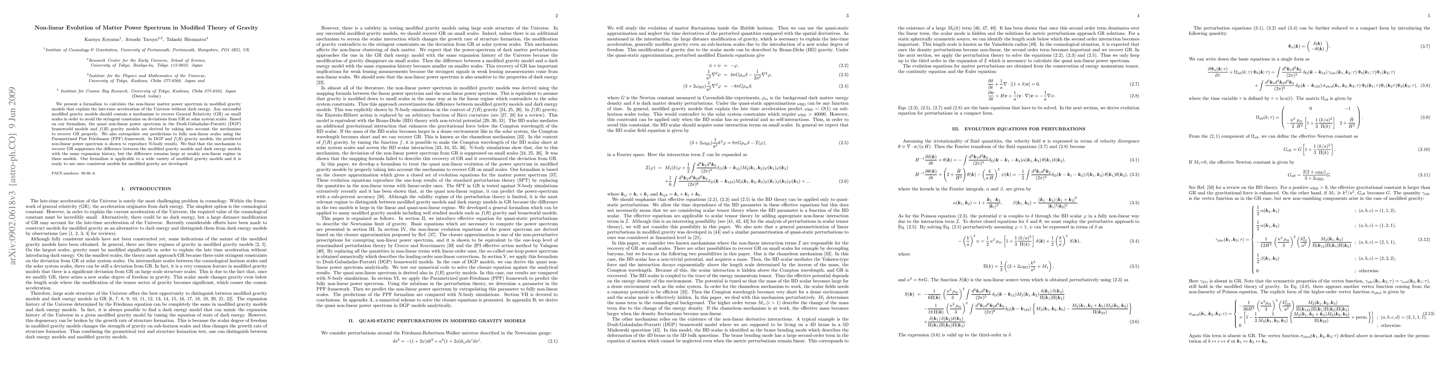 This paper presents a formalism for calculating the non-linear matter power spectrum in modified gravity models, focusing on those that explain cosmic acceleration without dark energy. The study derives quasi non-linear power spectra for DGP and $f(R)$ gravity models, showing that mechanisms to recover General Relativity suppress differences from dark energy models, though distinctions remain in weakly non-linear regimes.