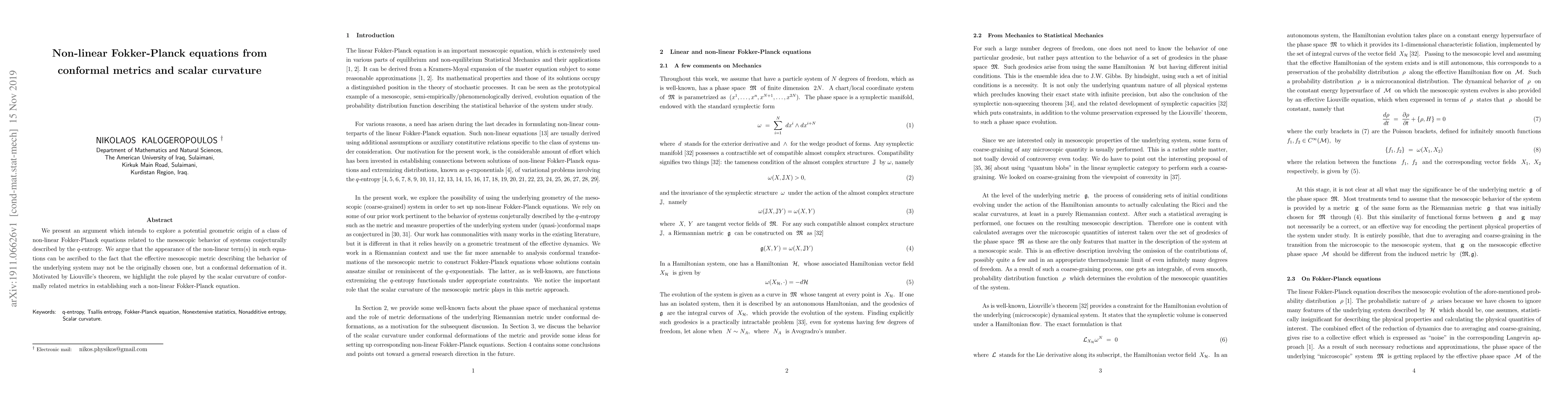 We present an argument which intends to explore a potential geometric origin of a class of non-linear Fokker-Planck equations related to the mesoscopic behavior of systems conjecturally described by the $q$-entropy. We argue that the appearance of the non-linear term(s) in such equations can be ascribed to the fact that the effective mesoscopic metric describing the behavior of the underlying system may not be the originally chosen one, but a conformal deformation of it. Motivated by Liouville's theorem, we highlight the role played by the scalar curvature of conformally related metrics in establishing such a non-linear Fokker-Planck equation.