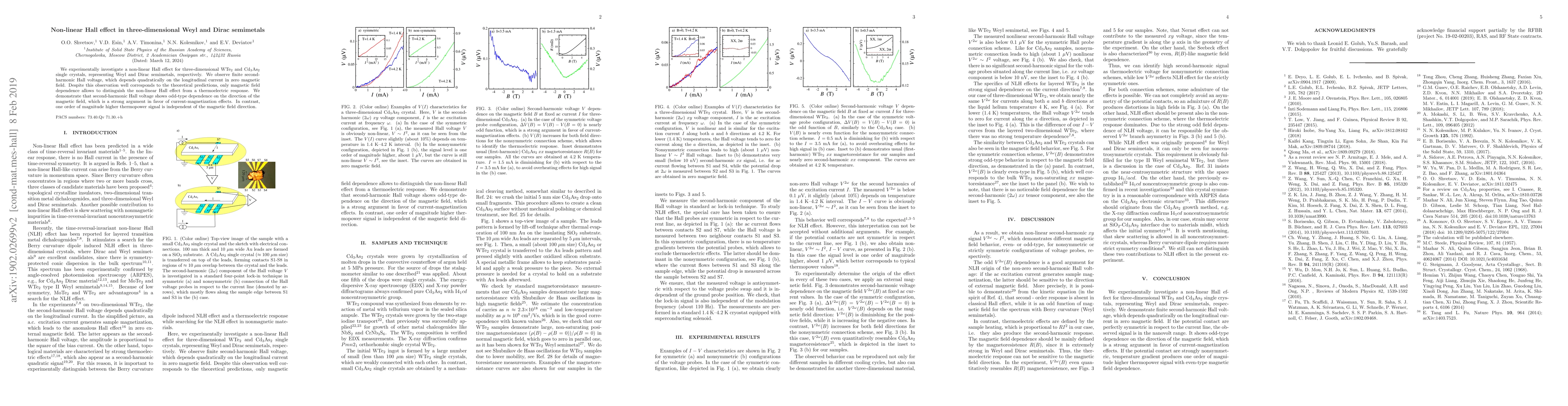 We experimentally investigate a non-linear Hall effect for three-dimensional WTe$_2$ and Cd$_3$As$_2$ single crystals, representing Weyl and Dirac semimetals, respectively. We observe finite second-harmonic Hall voltage, which depends quadratically on the longitudinal current in zero magnetic field. Despite this observation well corresponds to the theoretical predictions, only magnetic field dependence allows to distinguish the non-linear Hall effect from a thermoelectric response. We demonstrate that second-harmonic Hall voltage shows odd-type dependence on the direction of the magnetic field, which is a strong argument in favor of current-magnetization effects. In contrast, one order of magnitude higher thermopower signal is independent of the magnetic field direction.