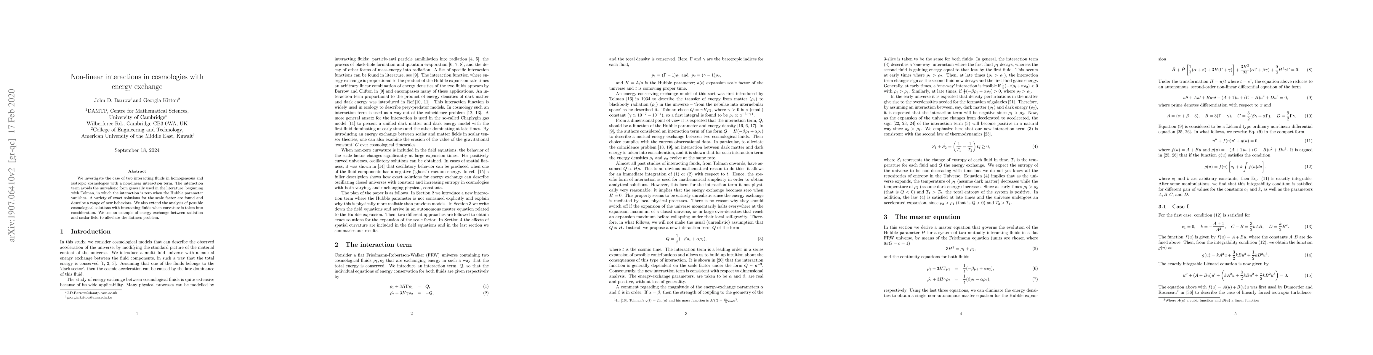 We investigate the case of two interacting fluids in homogeneous and isotropic cosmologies with a non-linear interaction term. The interaction term avoids the unrealistic form generally used in the literature, beginning with Tolman, in which the interaction is zero when the Hubble parameter vanishes. A variety of exact solutions for the scale factor are found and describe a range of new behaviors. We also extend the analysis of possible cosmological solutions with interacting fluids when curvature is taken into consideration. We use an example of energy exchange between radiation and scalar field to alleviate the flatness problem.