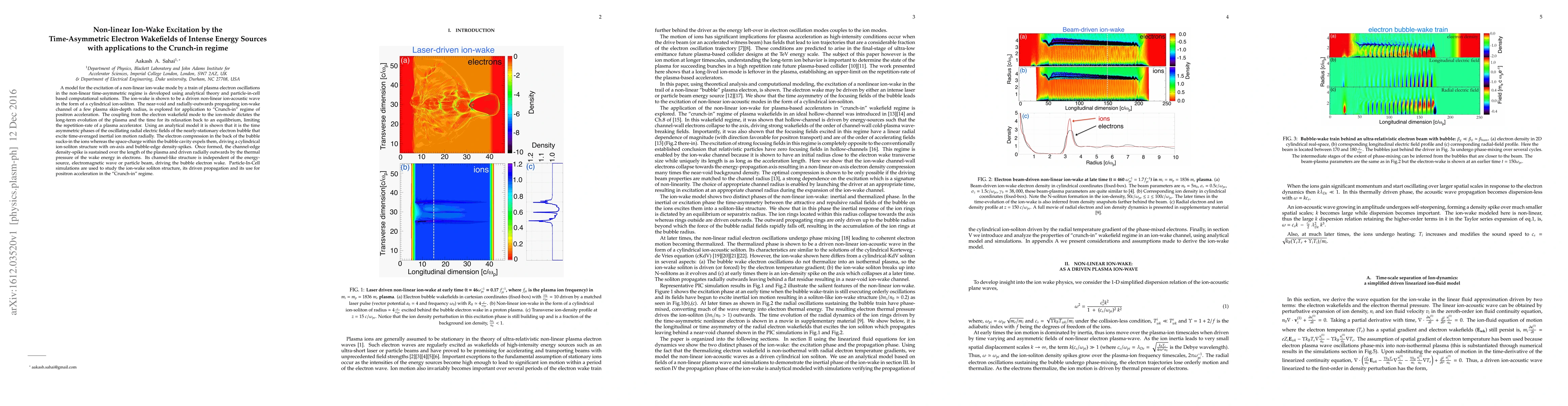 This paper develops a model for non-linear ion-wake excitation by time-asymmetric electron wakefields in intense energy sources, showing it forms a cylindrical ion-soliton. The study explores its application in the "Crunch-in" regime for positron acceleration, demonstrating the role of electron compression and space-charge in driving ion motion and sustaining a channel-like density-spike.