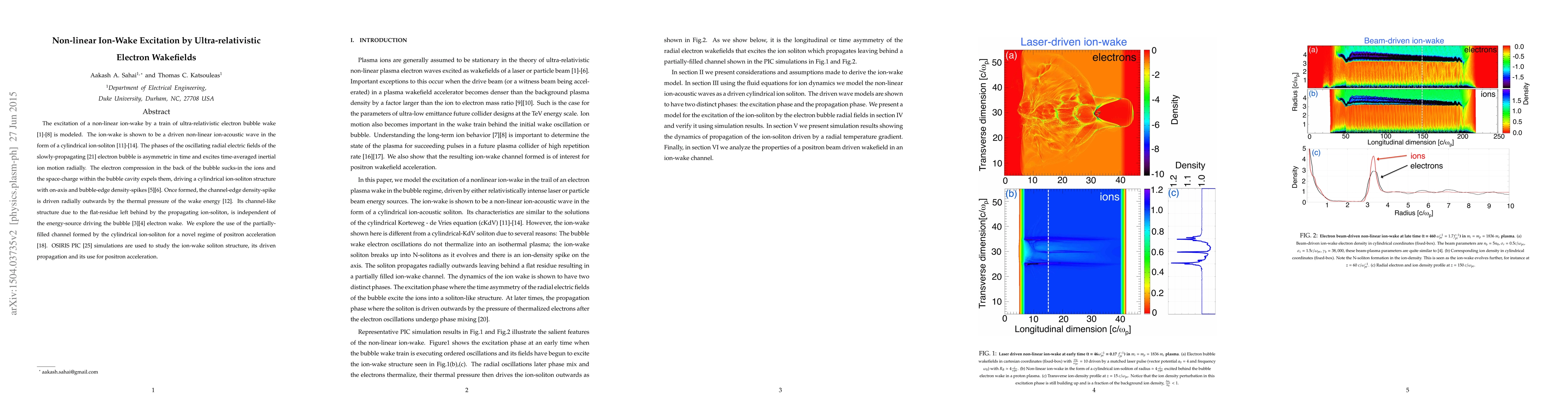 The excitation of a non-linear ion-wake by a train of ultra-relativistic electron bubble wake [1]-[8] is modeled. The ion-wake is shown to be a driven non-linear ion-acoustic wave in the form of a cylindrical ion-soliton [11]-[14]. The phases of the oscillating radial electric fields of the slowly-propagating [21] electron bubble is asymmetric in time and excites time-averaged inertial ion motion radially. The electron compression in the back of the bubble sucks-in the ions and the space-charge within the bubble cavity expels them, driving a cylindrical ion-soliton structure with on-axis and bubble-edge density-spikes [5][6]. Once formed, the channel-edge density-spike is driven radially outwards by the thermal pressure of the wake energy [12]. Its channel-like structure due to the flat-residue left behind by the propagating ion-soliton, is independent of the energy-source driving the bubble [3][4] electron wake. We explore the use of the partially- filled channel formed by the cylindrical ion-soliton for a novel regime of positron acceleration [18]. OSIRIS PIC [25] simulations are used to study the ion-wake soliton structure, its driven propagation and its use for positron acceleration.