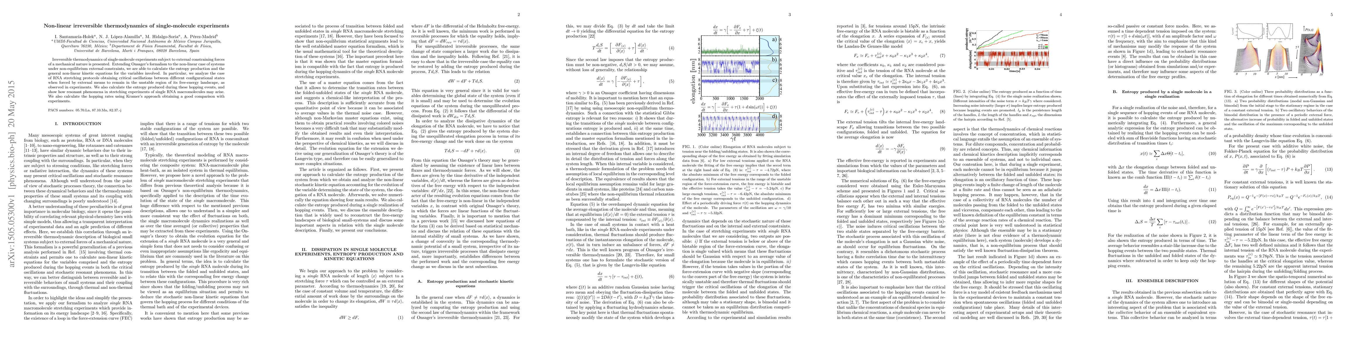 This paper extends Onsager's formalism to non-linear irreversible thermodynamics in single-molecule experiments, focusing on RNA stretching protocols. It calculates entropy production and kinetic equations, revealing critical oscillations and resonant phenomena in RNA macromolecules under external mechanical constraints.