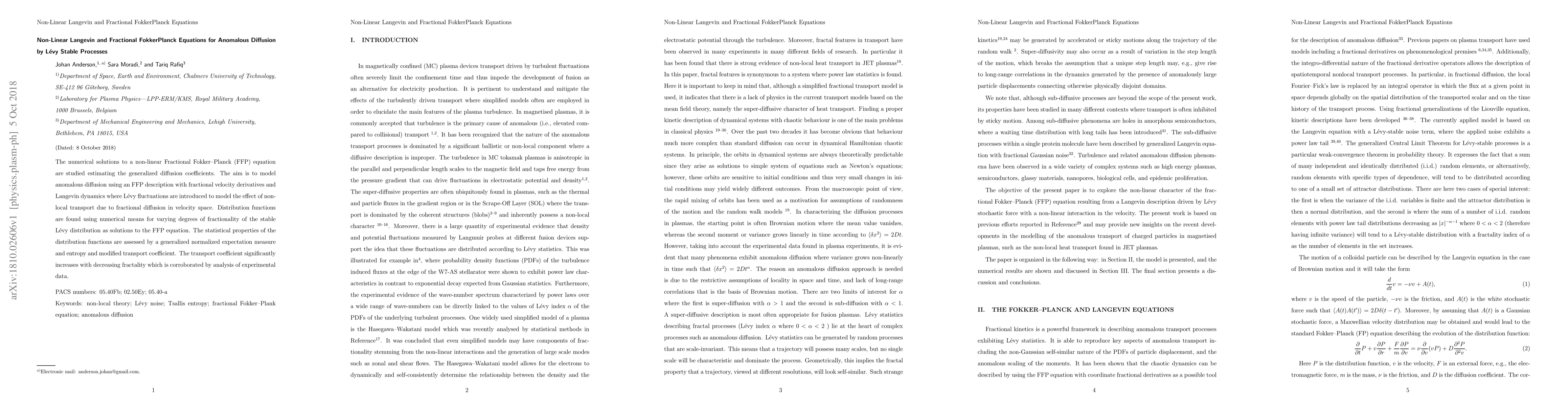 The~numerical solutions to a non-linear Fractional Fokker--Planck (FFP) equation are studied estimating the generalized diffusion coefficients. The~aim is to model anomalous diffusion using an FFP description with fractional velocity derivatives and Langevin dynamics where L\'{e}vy fluctuations are introduced to model the effect of non-local transport due to fractional diffusion in velocity space. Distribution functions are found using numerical means for varying degrees of fractionality of the stable L\'{e}vy distribution as solutions to the FFP equation. The~statistical properties of the distribution functions are assessed by a generalized normalized expectation measure and entropy and modified transport coefficient. The~transport coefficient significantly increases with decreasing fractality which is corroborated by analysis of experimental data.