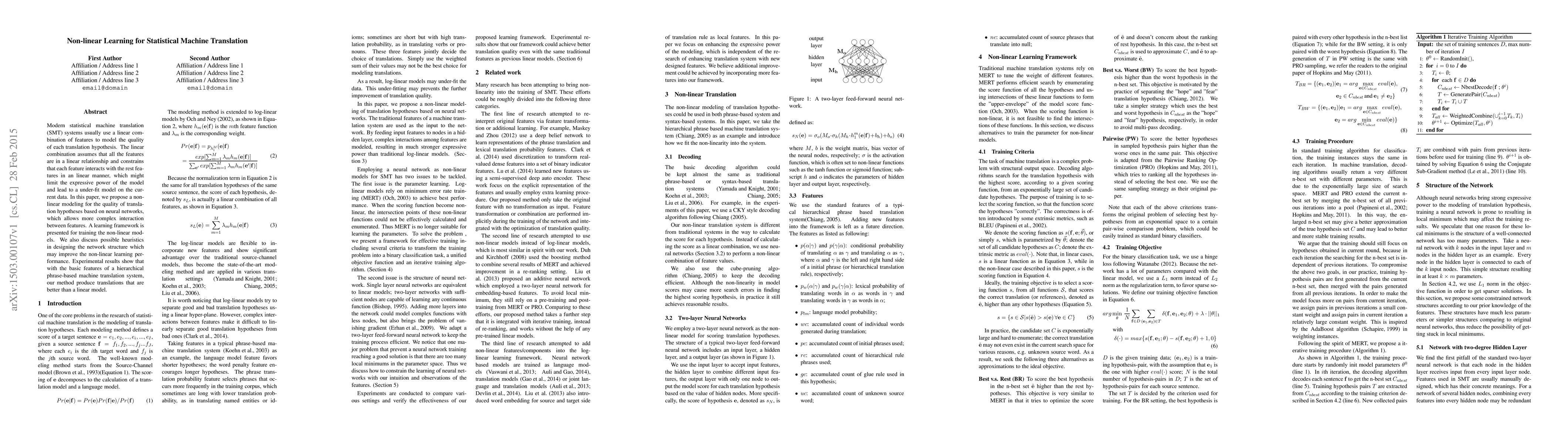 This paper proposes a non-linear neural network approach for statistical machine translation, moving beyond linear feature combinations to allow for more complex feature interactions. Experimental results demonstrate improved translation quality compared to traditional linear models.
