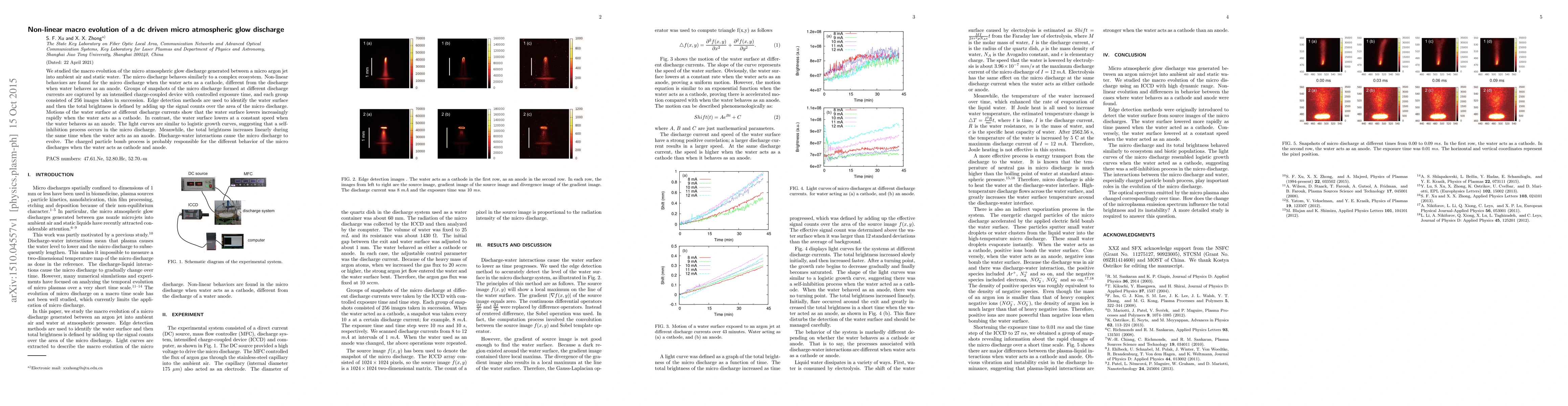 We studied the macro evolution of the micro atmospheric glow discharge generated between a micro argon jet into ambient air and static water. The micro discharge behaves similarly to a complex ecosystem. Non-linear behaviors are found for the micro discharge when the water acts as a cathode, different from the discharge when water behaves as an anode. Groups of snapshots of the micro discharge formed at different discharge currents are captured by an intensified charge-coupled device with controlled exposure time, and each group consisted of 256 images taken in succession. Edge detection methods are used to identify the water surface and then the total brightness is defined by adding up the signal counts over the area of the micro discharge. Motions of the water surface at different discharge currents show that the water surface lowers increasingly rapidly when the water acts as a cathode. In contrast, the water surface lowers at a constant speed when the water behaves as an anode. The light curves are similar to logistic growth curves, suggesting that a self-inhibition process occurs in the micro discharge. Meanwhile, the total brightness increases linearly during the same time when the water acts as an anode. Discharge-water interactions cause the micro discharge to evolve. The charged particle bomb process is probably responsible for the different behavior of the micro discharges when the water acts as cathode and anode.
