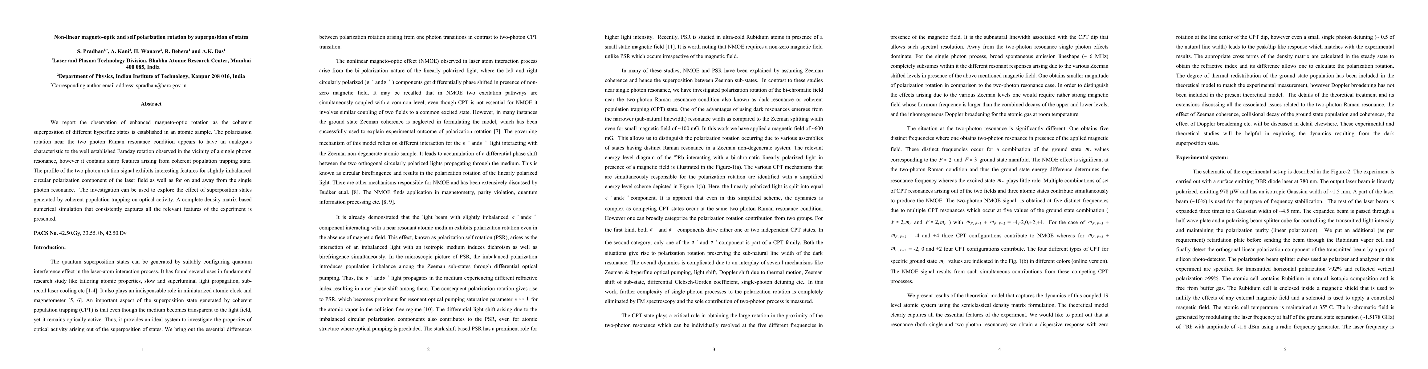 We report the observation of enhanced magneto-optic rotation as the coherent superposition of different hyperfine states is established in an atomic sample. The polarization rotation near the two photon Raman resonance condition appears to have an analogous characteristic to the well established Faraday rotation observed in the vicinity of a single photon resonance, however it contains sharp features arising from coherent population trapping state. The profile of the two photon rotation signal exhibits interesting features for slightly imbalanced circular polarization component of the laser field as well as for on and away from the single photon resonance. The investigation can be used to explore the effect of superposition states generated by coherent population trapping on optical activity. A complete density matrix based numerical simulation that consistently captures all the relevant features of the experiment is presented.