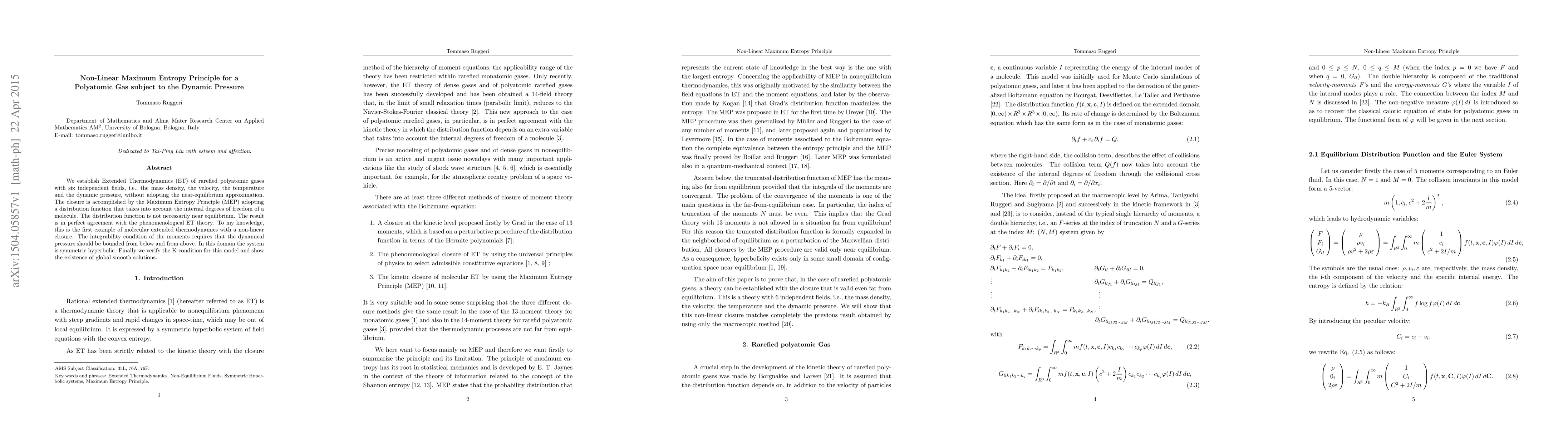 We establish Extended Thermodynamics (ET) of rarefied polyatomic gases with six independent fields, i.e., the mass density, the velocity, the temperature and the dynamic pressure, without adopting the near-equilibrium approximation. The closure is accomplished by the Maximum Entropy Principle (MEP) adopting a distribution function that takes into account the internal degrees of freedom of a molecule. The distribution function is not necessarily near equilibrium. The result is in perfect agreement with the phenomenological ET theory. To my knowledge, this is the first example of molecular extended thermodynamics with a non-linear closure. The integrability condition of the moments requires that the dynamical pressure should be bounded from below and from above. In this domain the system is symmetric hyperbolic. Finally we verify the K-condition for this model and show the existence of global smooth solutions.