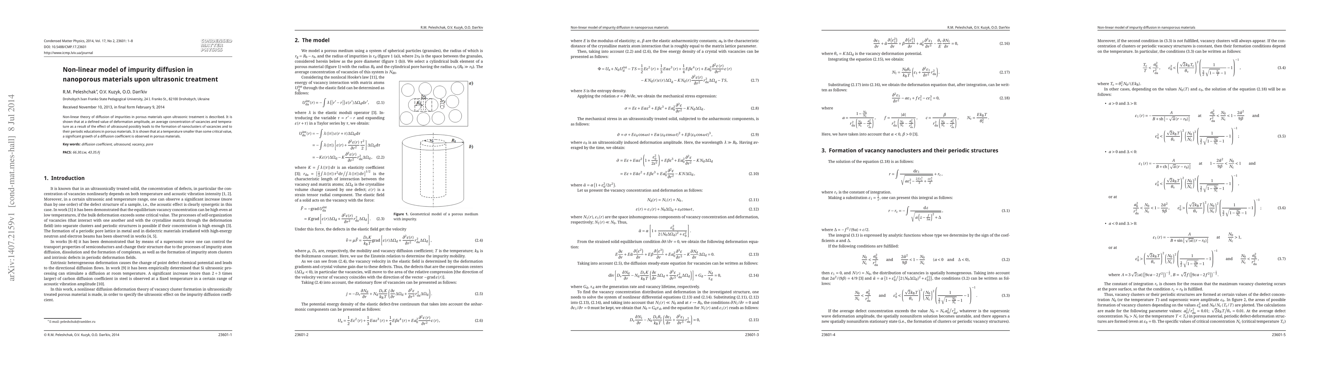 Non-linear theory of diffusion of impurities in porous materials upon ultrasonic treatment is described. It is shown that at a defined value of deformation amplitude, an average concentration of vacancies and temperature as a result of the effect of ultrasound possibly leads to the formation of nanoclusters of vacancies and to their periodic educations in porous materials. It is shown that at a temperature smaller than some critical value, a significant growth of a diffusion coefficient is observed in porous materials.