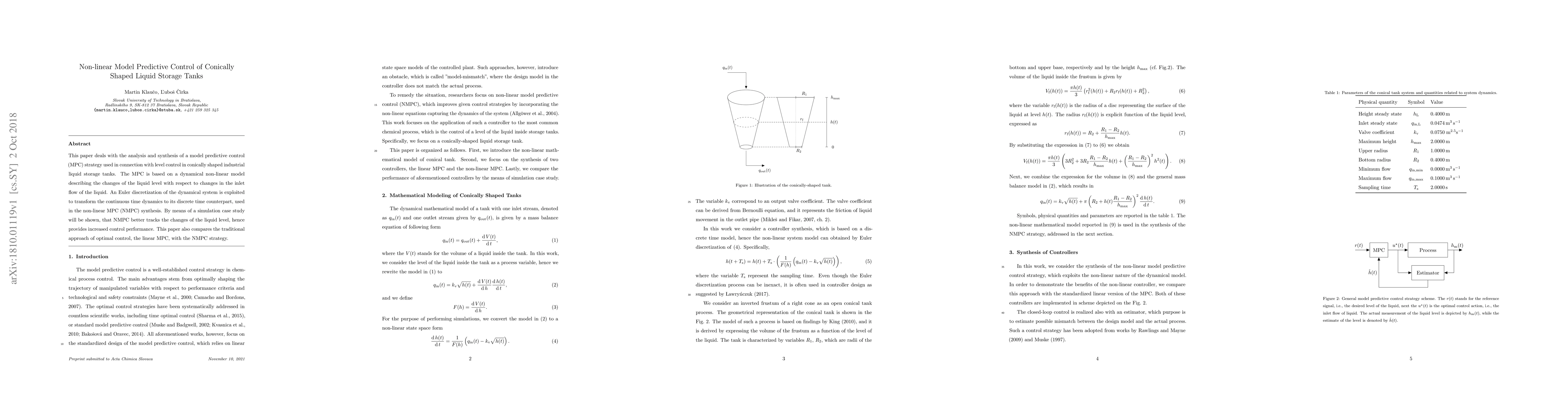 This paper proposes a non-linear model predictive control (NMPC) strategy for level control in conically shaped liquid storage tanks, demonstrating improved performance over linear MPC through simulation. The NMPC is based on a non-linear dynamical model and Euler discretization, showing better tracking of liquid level changes.