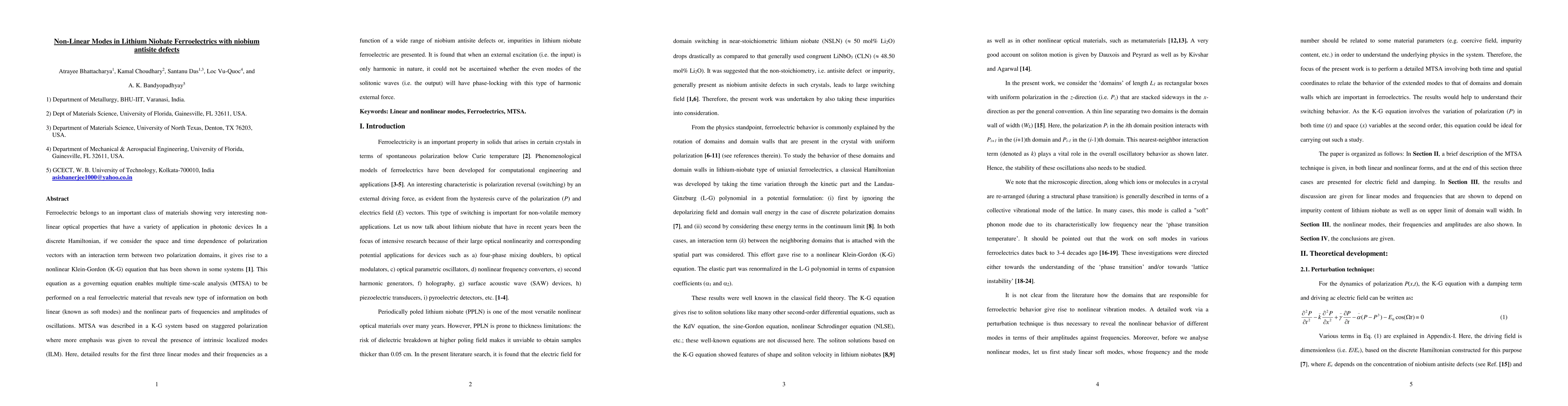 Ferroelectric belongs to an important class of materials showing very interesting nonlinear optical properties that have a variety of application in photonic devices In a discrete Hamiltonian, if we consider the space and time dependence of polarization vectors with an interaction term between two polarization domains, it gives rise to a nonlinear Klein-Gordon (K-G) equation that has been shown in some systems [1]. This equation as a governing equation enables multiple time-scale analysis (MTSA) to be performed on a real ferroelectric material that reveals new type of information on both linear (known as soft modes) and the nonlinear parts of frequencies and amplitudes of oscillations. MTSA was described in a K-G system based on staggered polarization where more emphasis was given to reveal the presence of intrinsic localized modes (ILM). Here, detailed results for the first three linear modes and their frequencies as a 2 function of a wide range of niobium antisite defects or, impurities in lithium niobate ferroelectric are presented. It is found that when an external excitation (i.e. the input) is only harmonic in nature, it could not be ascertained whether the even modes of the solitonic waves (i.e. the output) will have phase-locking with this type of harmonic external force.