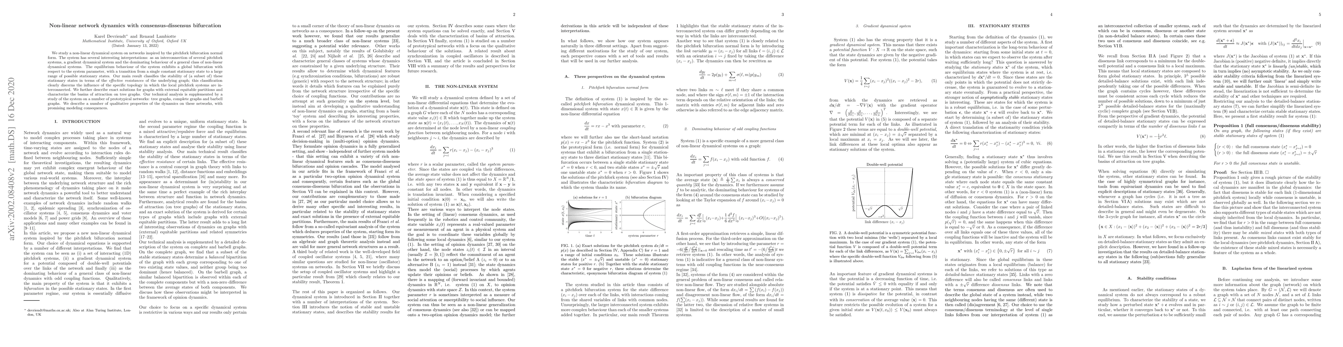 We study a non-linear dynamical system on networks inspired by the pitchfork bifurcation normal form. The system has several interesting interpretations: as an interconnection of several pitchfork systems, a gradient dynamical system and the dominating behaviour of a general class of non-linear dynamical systems. The equilibrium behaviour of the system exhibits a global bifurcation with respect to the system parameter, with a transition from a single constant stationary state to a large range of possible stationary states. Our main result classifies the stability of (a subset of) these stationary states in terms of the effective resistances of the underlying graph; this classification clearly discerns the influence of the specific topology in which the local pitchfork systems are interconnected. We further describe exact solutions for graphs with external equitable partitions and characterize the basins of attraction on tree graphs. Our technical analysis is supplemented by a study of the system on a number of prototypical networks: tree graphs, complete graphs and barbell graphs. We describe a number of qualitative properties of the dynamics on these networks, with promising modeling consequences.