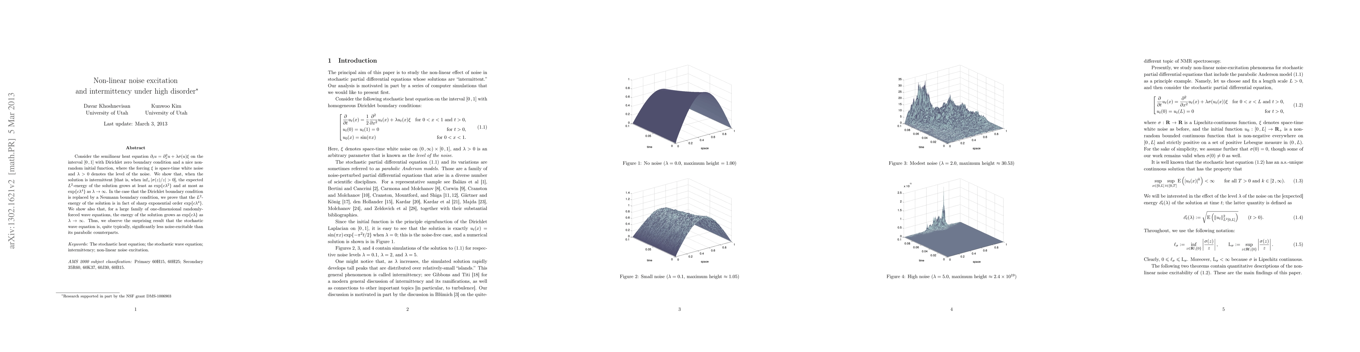 Consider the semilinear heat equation $\partial_t u = \partial^2_x u + \lambda\sigma(u)\xi$ on the interval $[0\,,1]$ with Dirichlet zero boundary condition and a nice non-random initial function, where the forcing $\xi$ is space-time white noise and $\lambda>0$ denotes the level of the noise. We show that, when the solution is intermittent [that is, when $\inf_z|\sigma(z)/z|>0$], the expected $L^2$-energy of the solution grows at least as $\exp\{c\lambda^2\}$ and at most as $\exp\{c\lambda^4\}$ as $\lambda\to\infty$. In the case that the Dirichlet boundary condition is replaced by a Neumann boundary condition, we prove that the $L^2$-energy of the solution is in fact of sharp exponential order $\exp\{c\lambda^4\}$. We show also that, for a large family of one-dimensional randomly-forced wave equations, the energy of the solution grows as $\exp\{c\lambda\}$ as $\lambda\to\infty$. Thus, we observe the surprising result that the stochastic wave equation is, quite typically, significantly less noise-excitable than its parabolic counterparts.