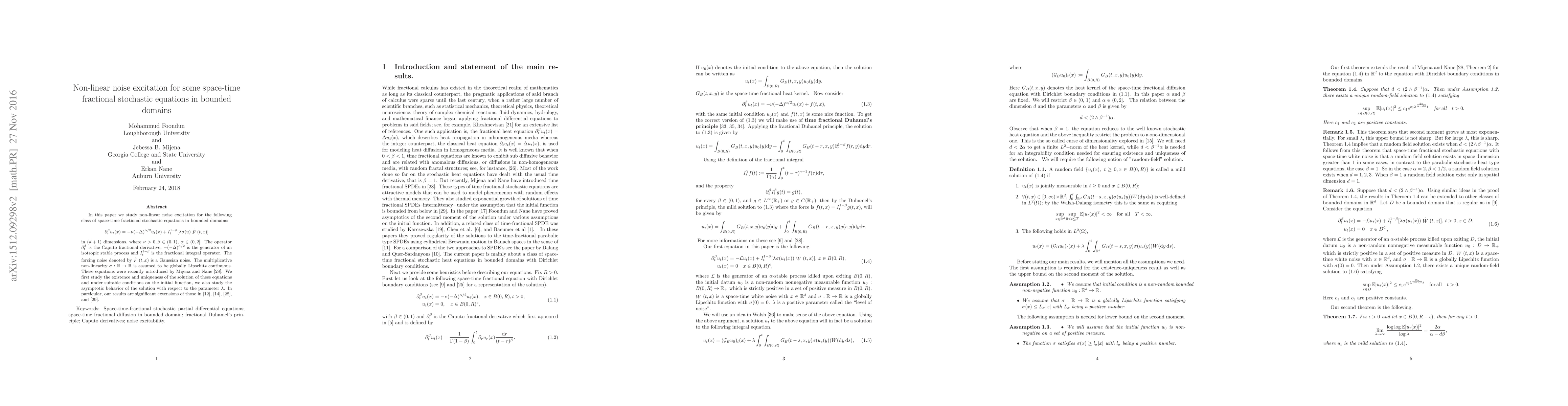 In this paper we study non-linear noise excitation for the following class of space-time fractional stochastic equations in bounded domains: $$\partial^\beta_tu_t(x)=-\nu(-\Delta)^{\alpha/2} u_t(x)+I^{1-\beta}_t[\lambda \sigma(u)\stackrel{\cdot}{F}(t,x)]$$ in $(d+1)$ dimensions, where $\nu>0, \beta\in (0,1)$, $\alpha\in (0,2]$. The operator $\partial^\beta_t$ is the Caputo fractional derivative, $-(-\Delta)^{\alpha/2} $ is the generator of an isotropic stable process and $I^{1-\beta}_t$ is the fractional integral operator. The forcing noise denoted by $\stackrel{\cdot}{F}(t,x)$ is a Gaussian noise. The multiplicative non-linearity $\sigma:\RR{R}\to\RR{R}$ is assumed to be globally Lipschitz continuous. These equations were recently introduced by Mijena and Nane(J. Mijena and E. Nane. Space time fractional stochastic partial differential equations. Stochastic Process Appl. 125 (2015), no. 9, 3301--3326). We first study the existence and uniqueness of the solution of these equations {and} under suitable conditions on the initial function, we {also} study the asymptotic behavior of the solution with respect to the parameter $\lambda$. In particular, our results are significant extensions of those in Foondun et al (M. Foondun, K. Tian and W. Liu. On some properties of a class of fractional stochastic equations. Preprint available at arxiv.org 1404.6791v1.), Foondun and Khoshnevisan (M. Foondun and D. Khoshnevisan. Intermittence and nonlinear parabolic stochastic partial differential equations, Electron. J. Probab. 14 (2009), no. 21, 548--568.), Nane and Mijena (J. Mijena and E. Nane. Space time fractional stochastic partial differential equations. Stochastic Process Appl. 125 (2015), no. 9, 3301--3326; J. B. Mijena, and E.Nane. Intermittence and time fractional partial differential equations. Submitted. 2014).