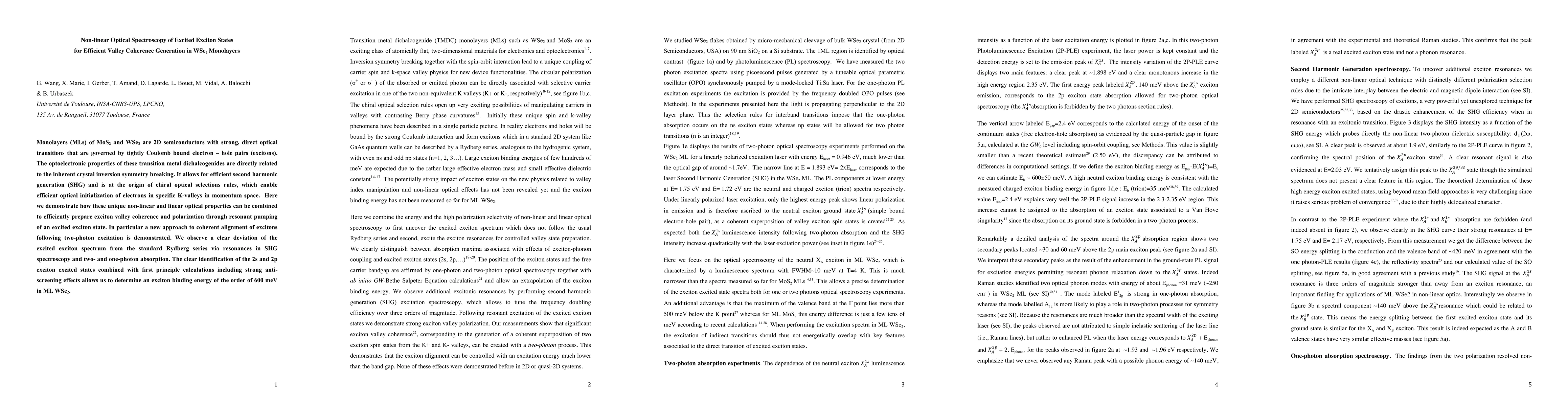 Monolayers (MLs) of MoS2 and WSe2 are 2D semiconductors with strong, direct optical transitions that are governed by tightly Coulomb bound eletron-hole pairs (excitons). The optoelectronic properties of these transition metal dichalcogenides are directly related to the inherent crystal inversion symmetry breaking. It allows for efficient second harmonic generation (SHG) and is at the origin of chiral optical selections rules, which enable efficient optical initialization of electrons in specific K-valleys in momentum space. Here we demonstrate how these unique non-linear and linear optical properties can be combined to efficiently prepare exciton valley coherence and polarization through resonant pumping of an excited exciton state. In particular a new approach to coherent alignment of excitons following two-photon excitation is demonstrated. We observe a clear deviation of the excited exciton spectrum from the standard Rydberg series via resonances in SHG spectroscopy and two- and one-photon absorption. The clear identification of the 2s and 2p exciton excited states combined with first principle calculations including strong anti-screening effects allows us to determine an exciton binding energy of the order of 600 meV in ML WSe2.