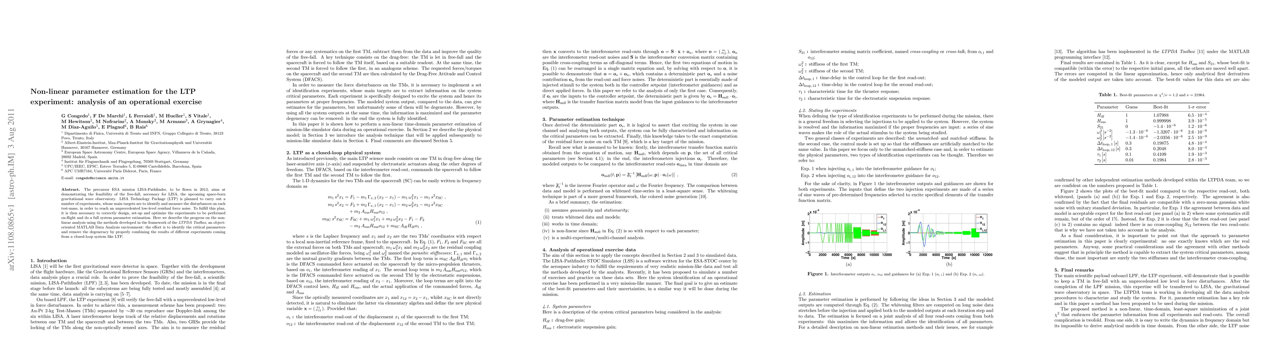 The precursor ESA mission LISA-Pathfinder, to be flown in 2013, aims at demonstrating the feasibility of the free-fall, necessary for LISA, the upcoming space-born gravitational wave observatory. LISA Technology Package (LTP) is planned to carry out a number of experiments, whose main targets are to identify and measure the disturbances on each test-mass, in order to reach an unprecedented low-level residual force noise. To fulfill this plan, it is then necessary to correctly design, set-up and optimize the experiments to be performed on-flight and do a full system parameter estimation. Here we describe the progress on the non-linear analysis using the methods developed in the framework of the \textit{LTPDA Toolbox}, an object-oriented MATLAB Data Analysis environment: the effort is to identify the critical parameters and remove the degeneracy by properly combining the results of different experiments coming from a closed-loop system like LTP.