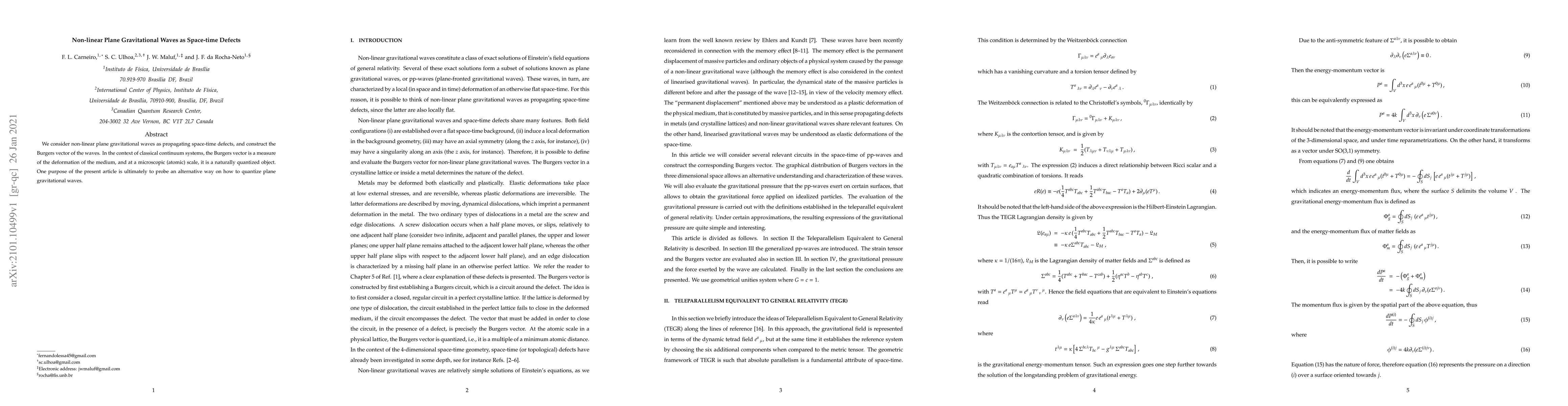 This paper explores non-linear plane gravitational waves as space-time defects, constructing a Burgers vector to measure their deformation. The study aims to propose an alternative method for quantizing these waves at a microscopic scale.