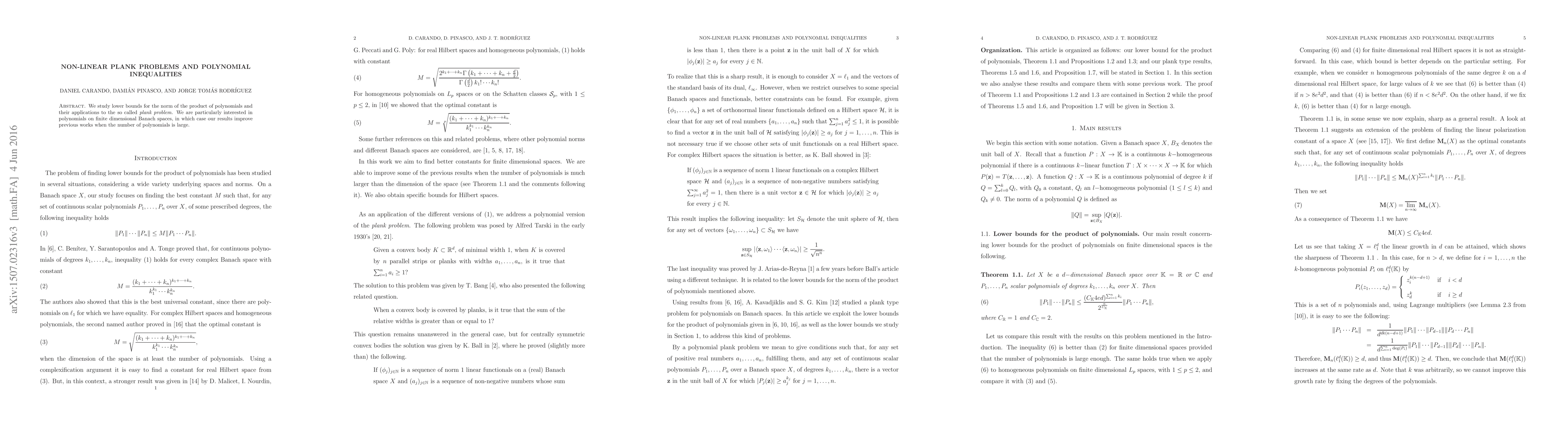 Summary: This paper investigates lower bounds for the norm of polynomial products and applies these findings to improve previous results regarding the plank problem, especially when dealing with a large number of polynomials in finite dimensional Banach spaces.
