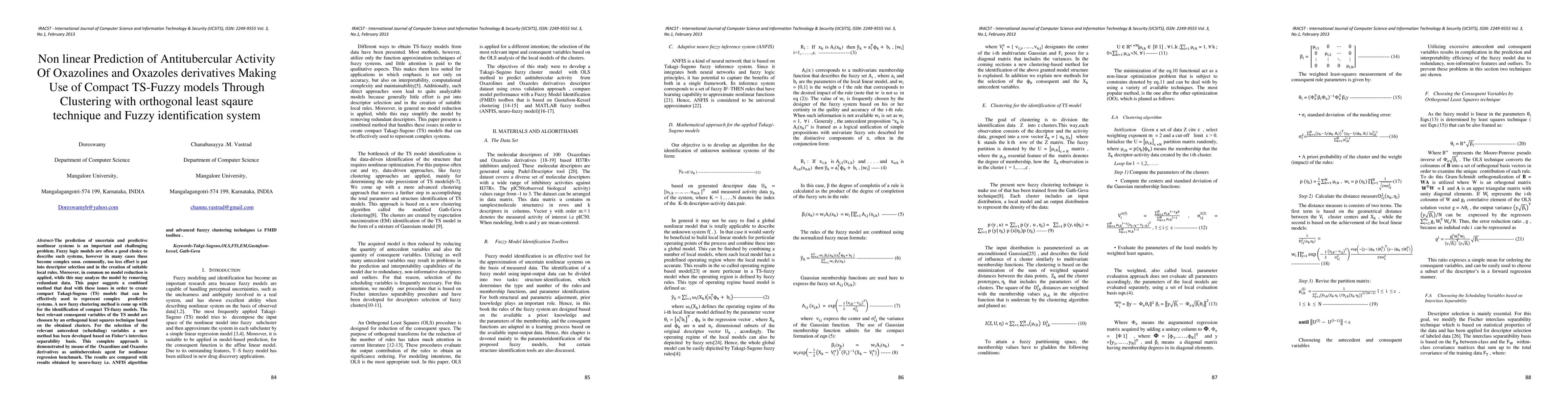 The prediction of uncertain and predictive nonlinear systems is an important and challenging problem. Fuzzy logic models are often a good choice to describe such systems however in many cases these become complex soon. commonlly, too less effort is put into descriptor selection and in the creation of suitable local rules. Moreover, in common no model reduction is applied, while this may analyze the model by removing redundant data. This paper suggests a combined method that deal with these issues in order to create compact Takagi Sugeno (TS) models that can be effectively used to represent complex predictive systems. A new fuzzy clustering method is come up with for the identification of compact TS-fuzzy models. The best relevant consequent variables of the TS model are choosen by an orthogonal least squares technique based on the obtained clusters.For the selection of the relevant antecedent (scheduling) variables a new method has been developed based on Fisher's interclass separability basis. This complete approach is demonstrated by means of the Oxazolines and Oxazoles derivatives as antituberculosis agent for nonlinear regression benchmark. The results are compared with results obtained by neuro-fuzzy i.e. ANFIS algorithm and advanced fuzzyy clustering techniques i.e FMID toolbox .