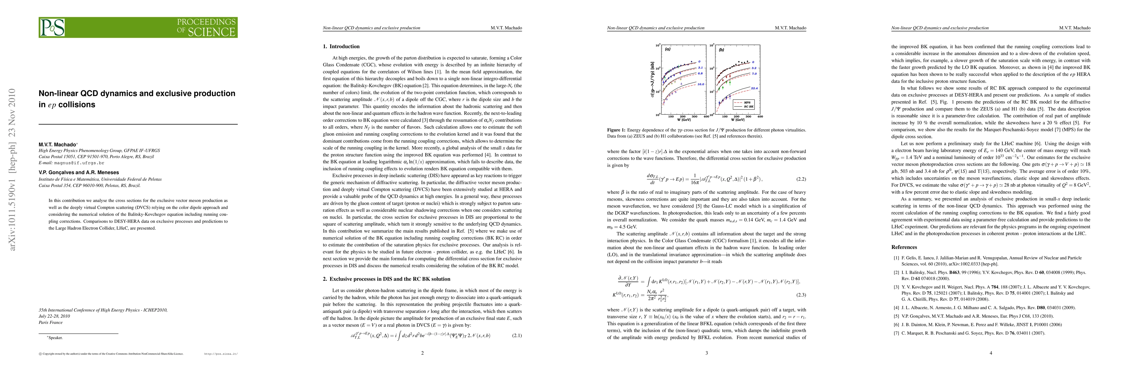 In this contribution we analyse the cross sections for the exclusive vector meson production as well as the deeply virtual Compton scattering (DVCS) relying on the color dipole approach and considering the numerical solution of the Balitsky-Kovchegov equation including running coupling corrections. Comparisons to DESY-HERA data on exclusive processes and predictions to the Large Hadron Electron Collider, LHeC, are presented.