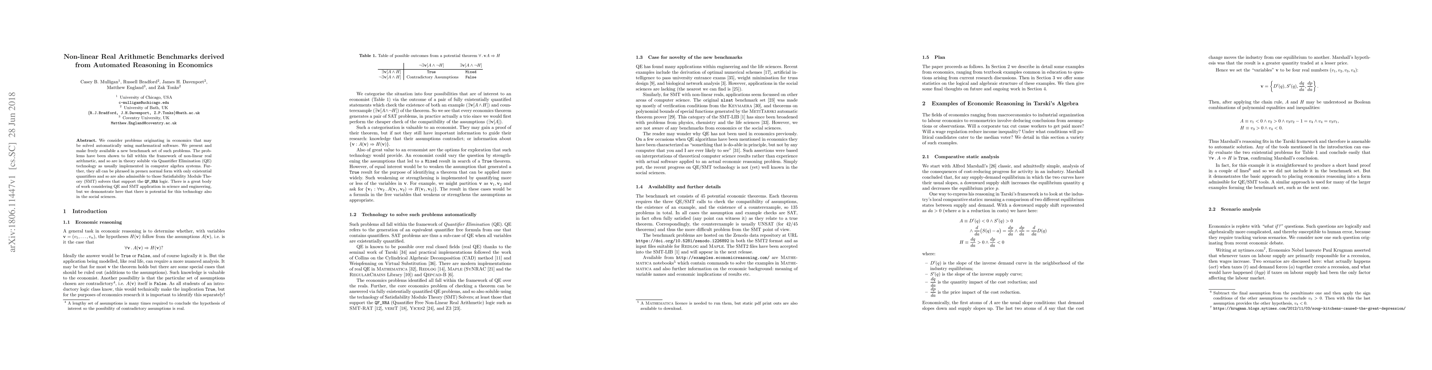 We consider problems originating in economics that may be solved automatically using mathematical software. We present and make freely available a new benchmark set of such problems. The problems have been shown to fall within the framework of non-linear real arithmetic, and so are in theory soluble via Quantifier Elimination (QE) technology as usually implemented in computer algebra systems. Further, they all can be phrased in prenex normal form with only existential quantifiers and so are also admissible to those Satisfiability Module Theory (SMT) solvers that support the QF_NRA. There is a great body of work considering QE and SMT application in science and engineering, but we demonstrate here that there is potential for this technology also in the social sciences.
