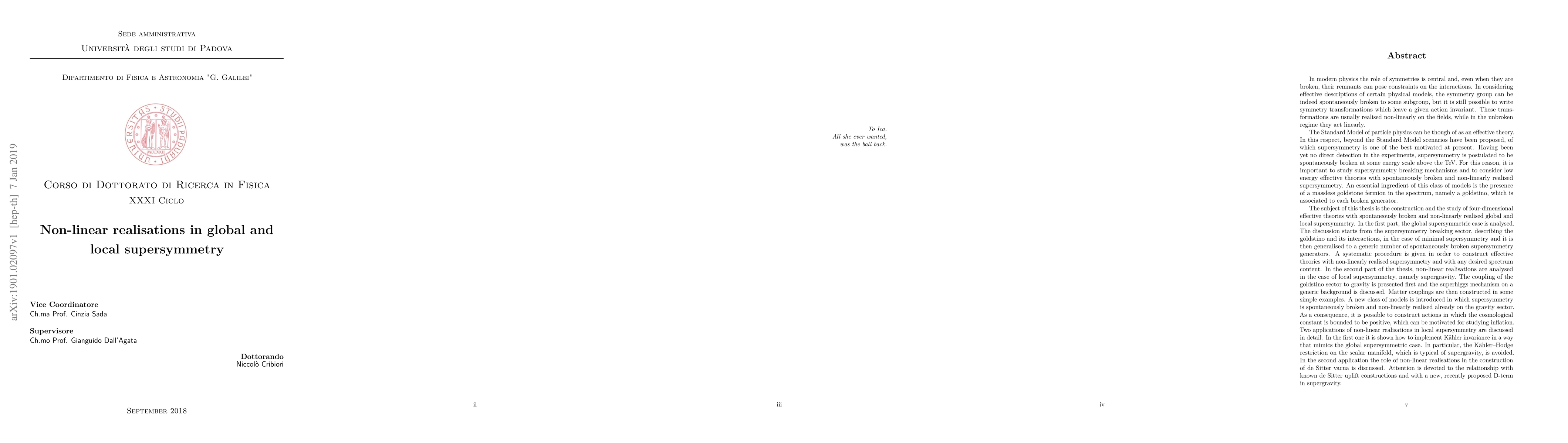 This thesis explores four-dimensional effective theories with spontaneously broken and non-linearly realised global and local supersymmetry, introducing new models where the cosmological constant is positive, potentially aiding inflation studies. It also discusses the implementation of Kähler invariance and the construction of de Sitter vacua.