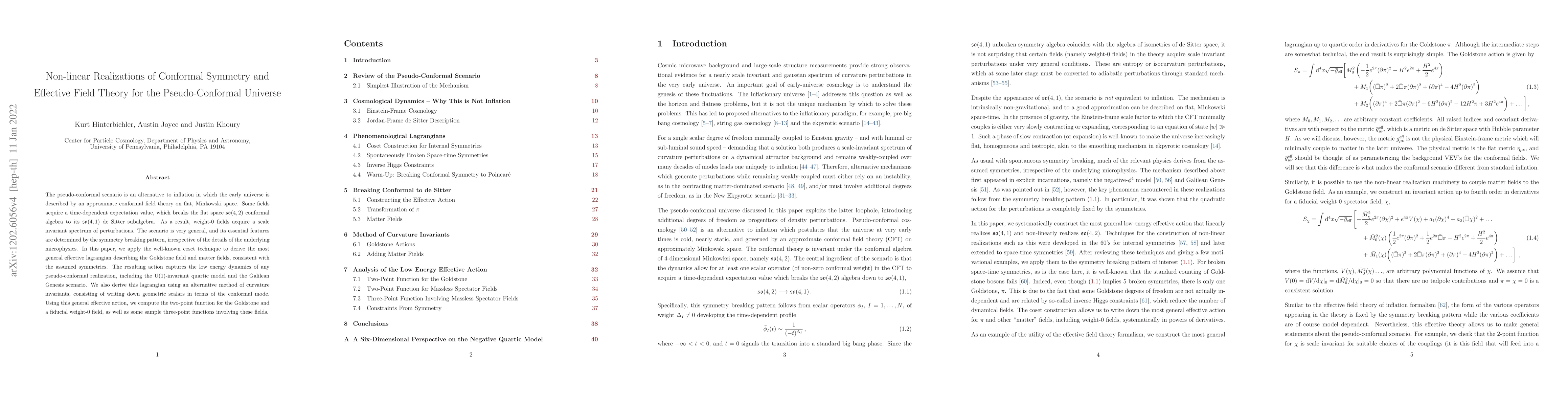 The pseudo-conformal scenario is an alternative to inflation in which the early universe is described by an approximate conformal field theory on flat, Minkowski space. Some fields acquire a time-dependent expectation value, which breaks the flat space so(4,2) conformal algebra to its so(4,1) de Sitter subalgebra. As a result, weight-0 fields acquire a scale invariant spectrum of perturbations. The scenario is very general, and its essential features are determined by the symmetry breaking pattern, irrespective of the details of the underlying microphysics. In this paper, we apply the well-known coset technique to derive the most general effective lagrangian describing the Goldstone field and matter fields, consistent with the assumed symmetries. The resulting action captures the low energy dynamics of any pseudo-conformal realization, including the U(1)-invariant quartic model and the Galilean Genesis scenario. We also derive this lagrangian using an alternative method of curvature invariants, consisting of writing down geometric scalars in terms of the conformal mode. Using this general effective action, we compute the two-point function for the Goldstone and a fiducial weight-0 field, as well as some sample three-point functions involving these fields.