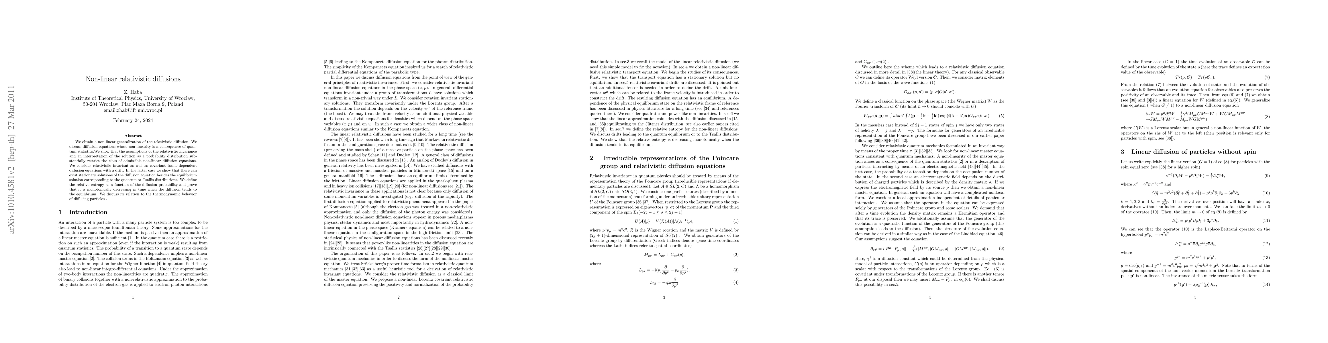 We obtain a non-linear generalization of the relativistic diffusion of particles with spin. We discuss diffusion equations whose non-linearity is a consequence of quantum statistics. We show that the assumptions of the relativistic invariance and an interpretation of the solution as a probability distribution substantially restrict the class of admissible non-linear diffusion equations. We consider relativistic invariant as well as covariant frame dependent diffusion equations with a drift. In the latter case we show that there can exist stationary solutions of the diffusion equation besides the equilibrium solution corresponding to the quantum or Tsallis distributions. We define the relative entropy as a function of the diffusion probability and prove that it is monotonically decreasing in time when the diffusion tends to the equilibrium. We discuss its relation to the thermodynamic behavior of diffusing particles.