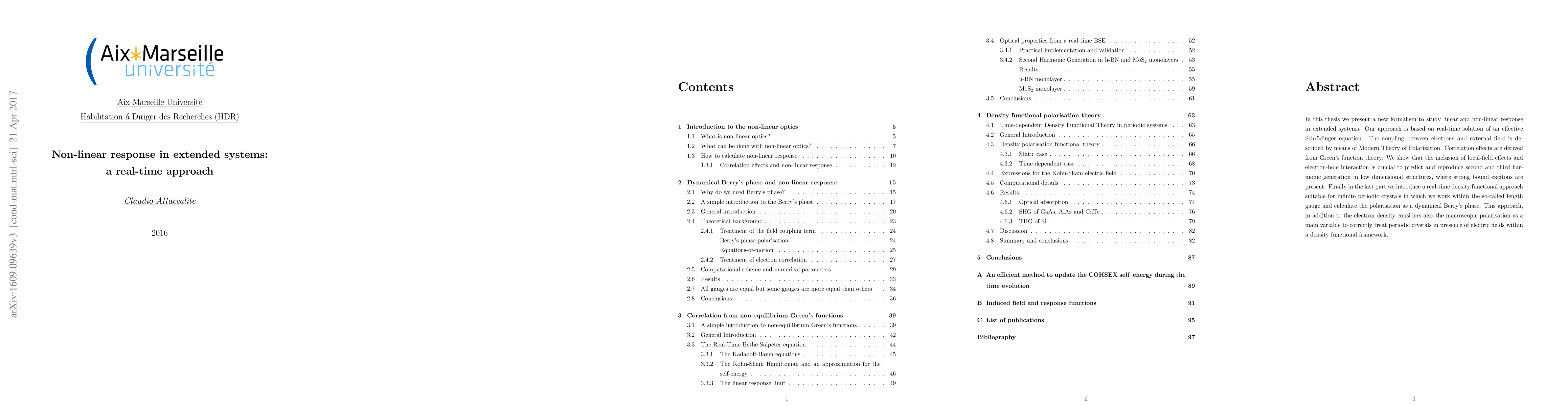 In this thesis we present a new formalism to study linear and non-linear response in extended systems. Our approach is based on real-time solution of an effective Schr\"odinger equation. The coupling between electrons and external field is described by means of Modern Theory of Polarization. Correlation effects are derived from Green's function theory. We show that the inclusion of local-field effects and electron-hole interaction is crucial to predict and reproduce second and third harmonic generation in low dimensional structures, where strong bound excitons are present. Finally in the last part we introduce a real-time density functional approach suitable for infinite periodic crystals in which we work within the so-called length gauge and calculate the polarisation as a dynamical Berry's phase. This approach, in addition to the electron density considers also the macroscopic polarisation as a main variable to correctly treat periodic crystals in presence of electric fields within a density functional framework.