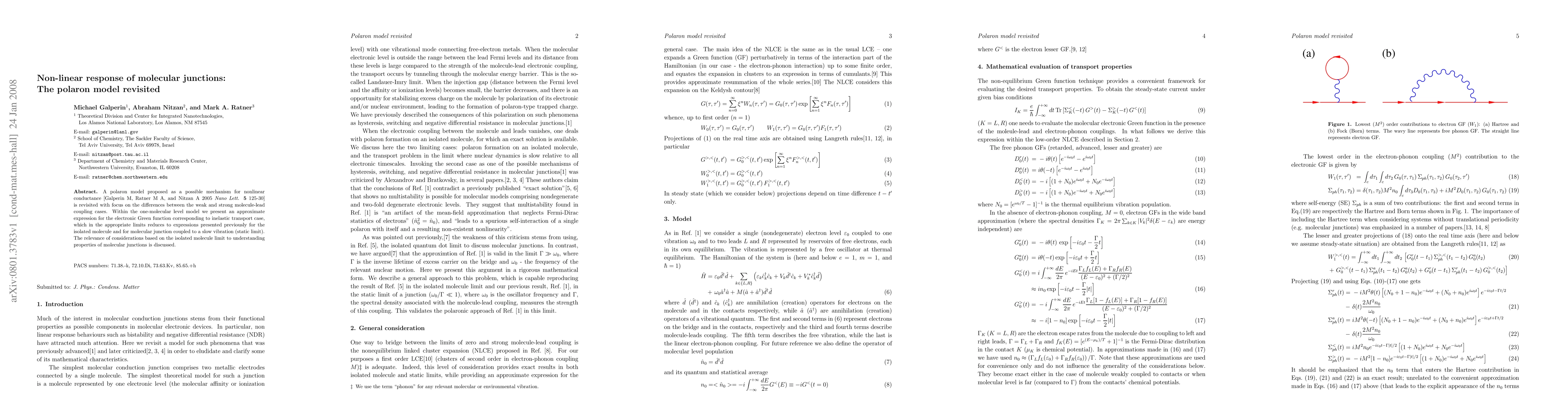 This paper revisits the polaron model to explain nonlinear conductance in molecular junctions, comparing weak and strong molecule-lead coupling scenarios. It provides an approximate expression for the electronic Green function in the inelastic transport case, highlighting the relevance of the isolated molecule limit for understanding molecular junction properties.